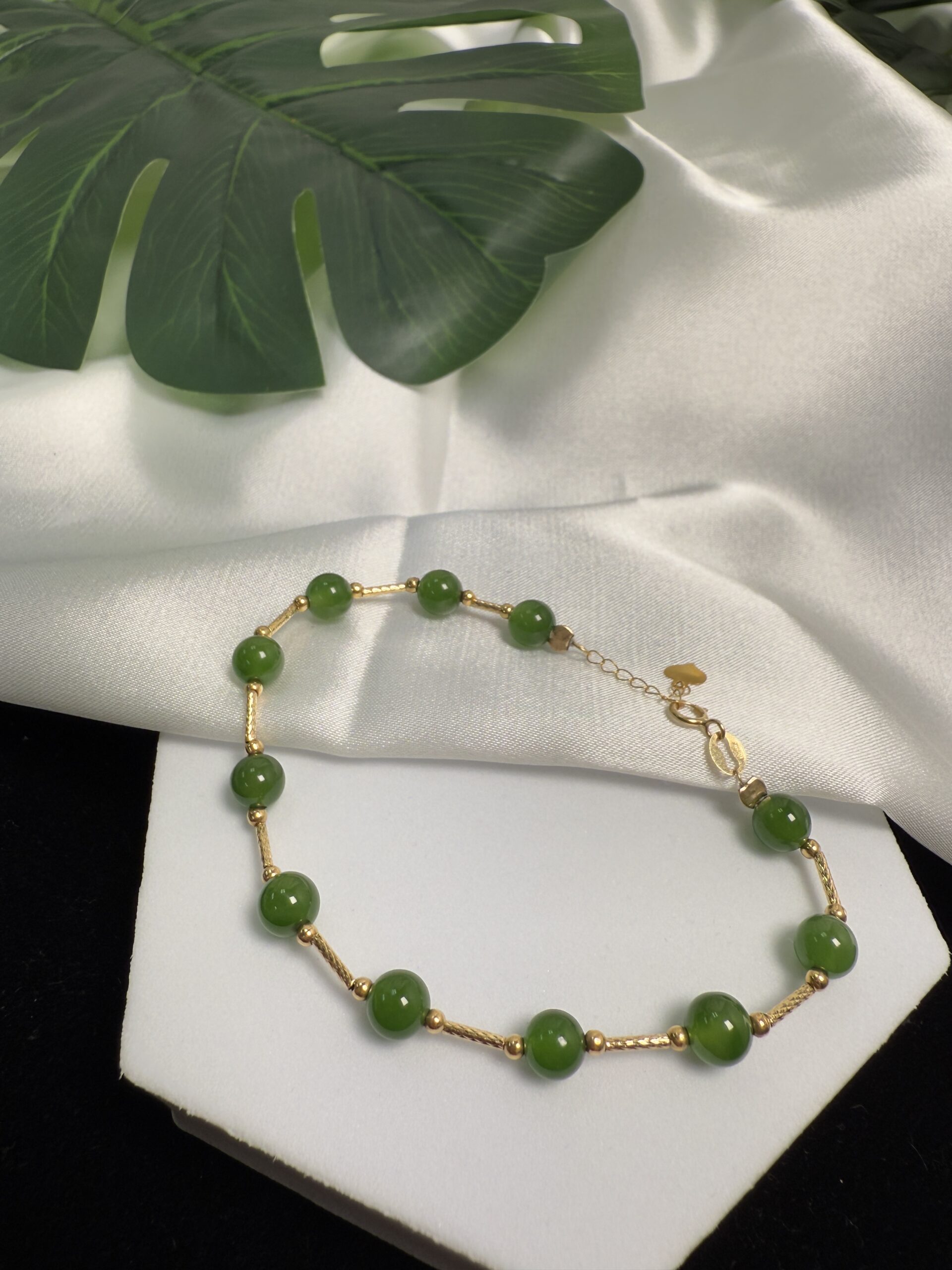 Composition: 6mm green nephrite jade bead# (11) framed in 18k gold bracelet