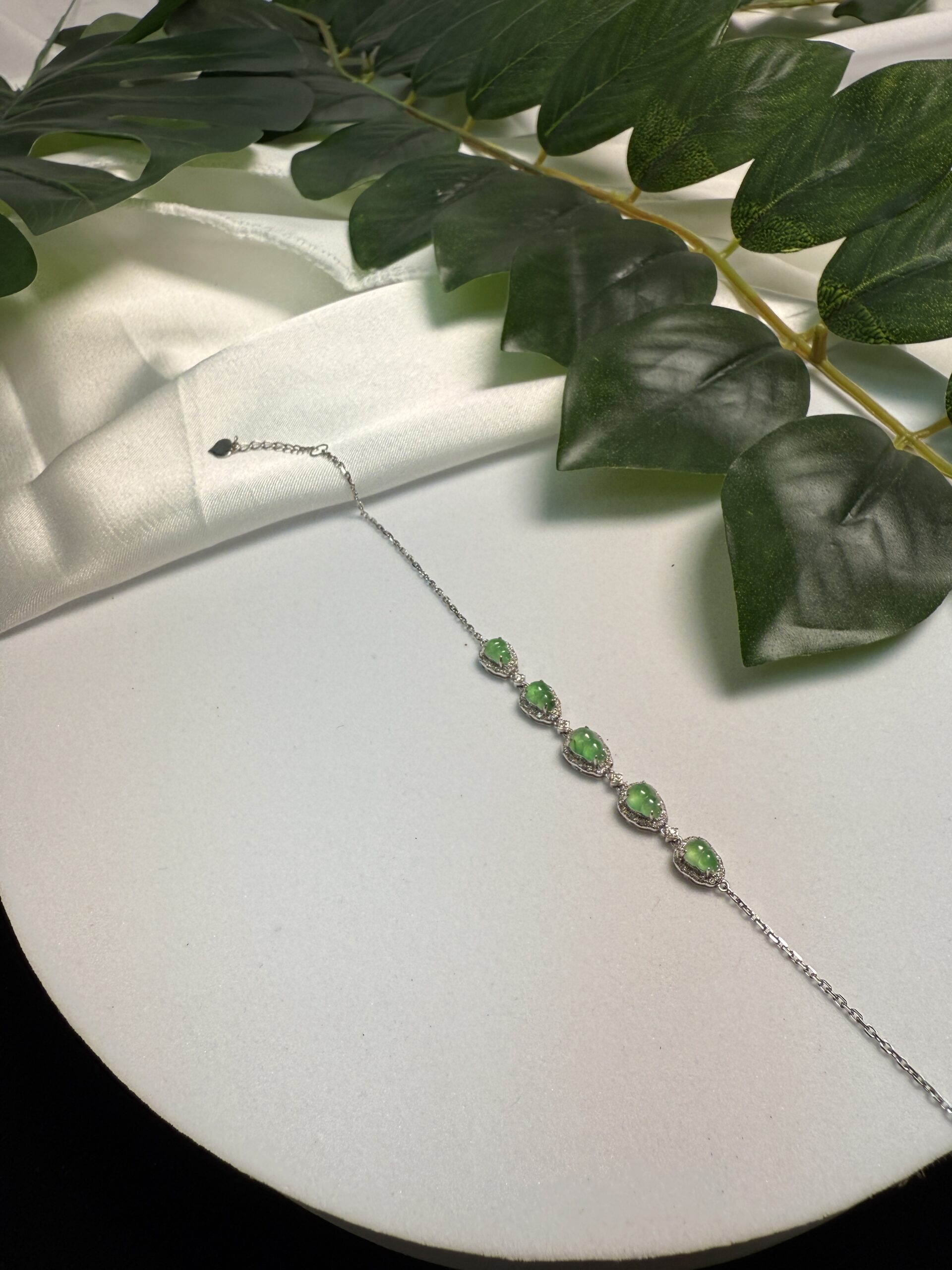 Composition: Ice-type bright green hulu jadeite# measuring 7.1×5.6×4.3mm each (5) framed in 18k gold inlaid natural diamond bracelet