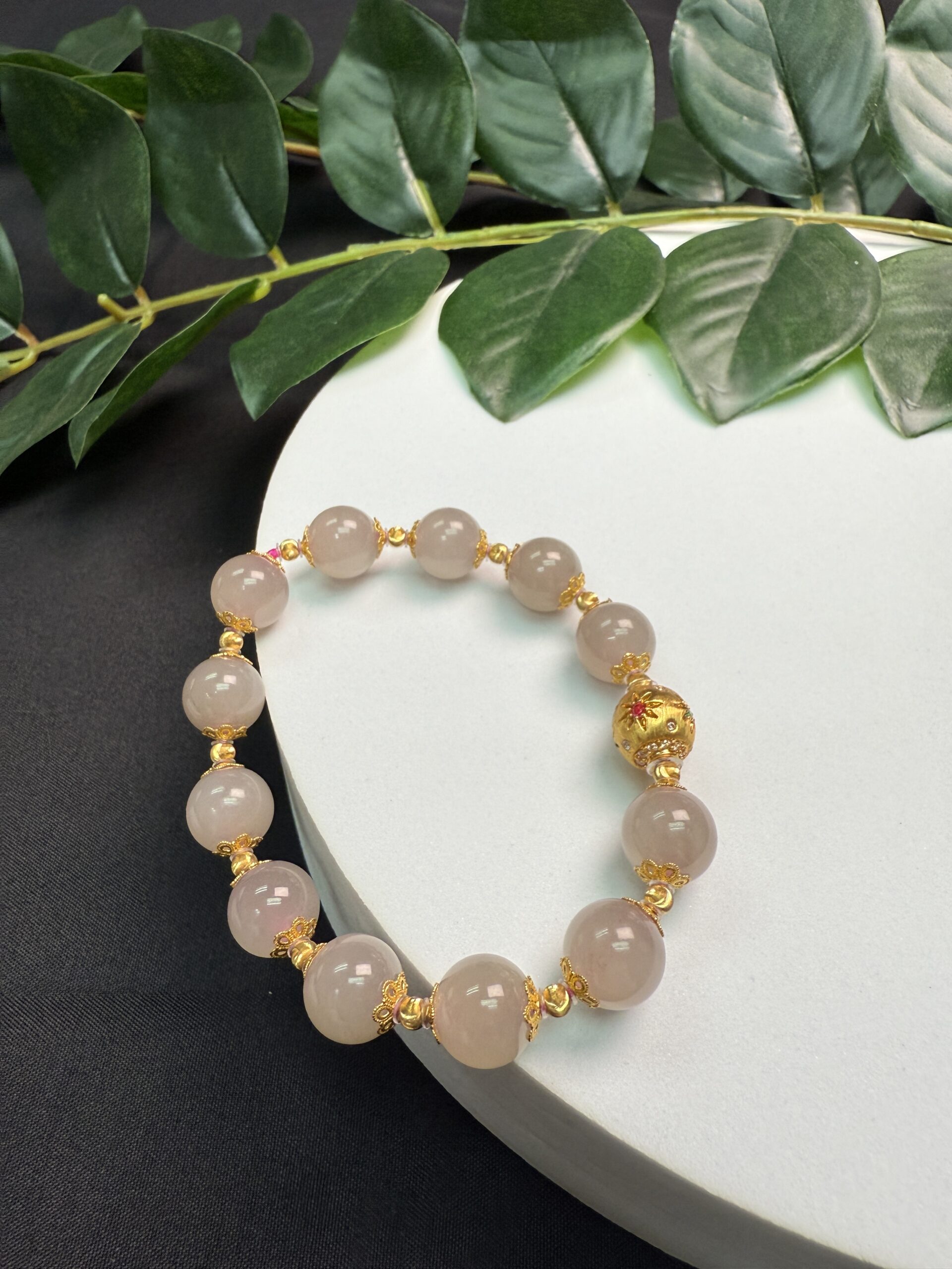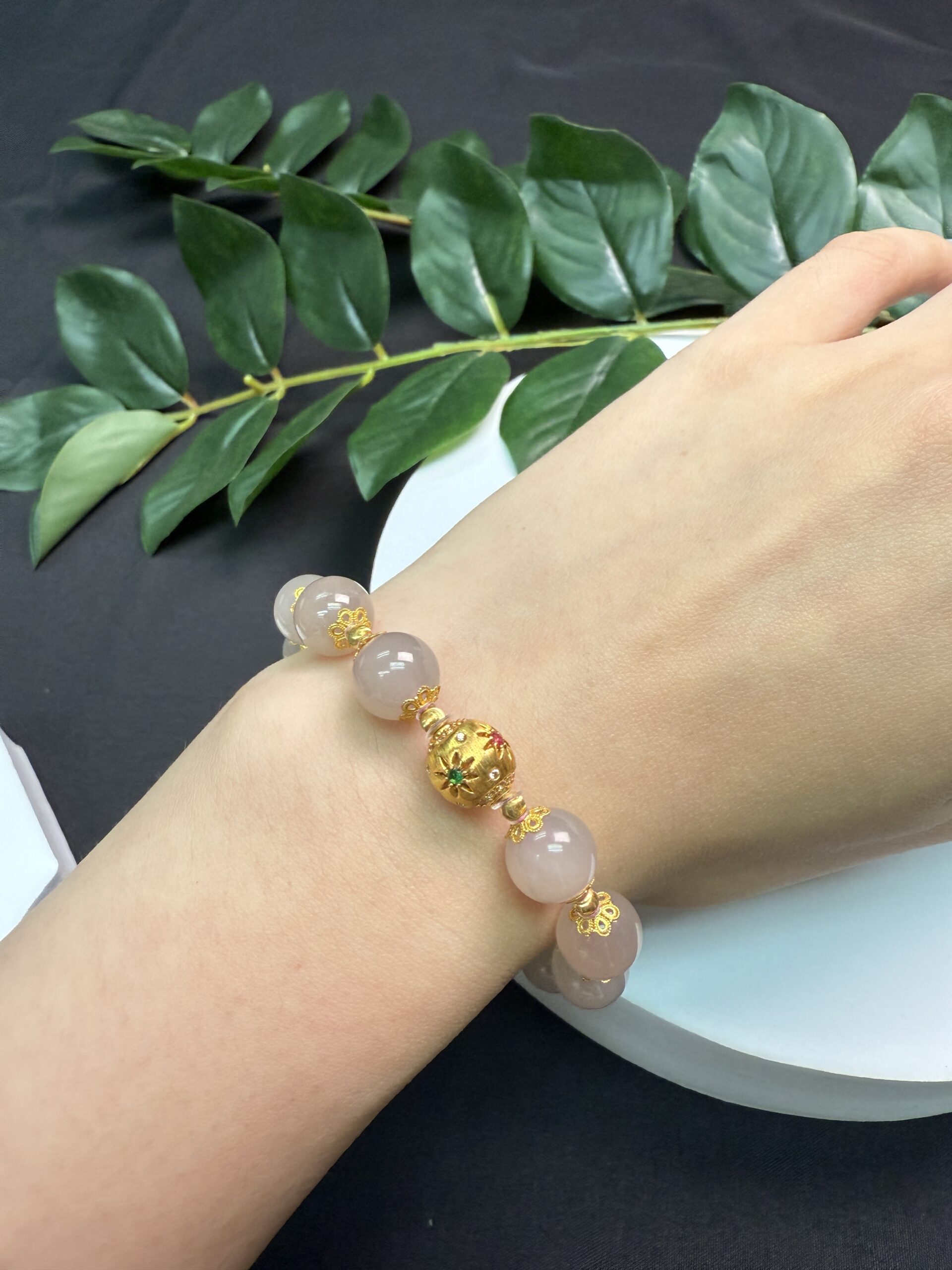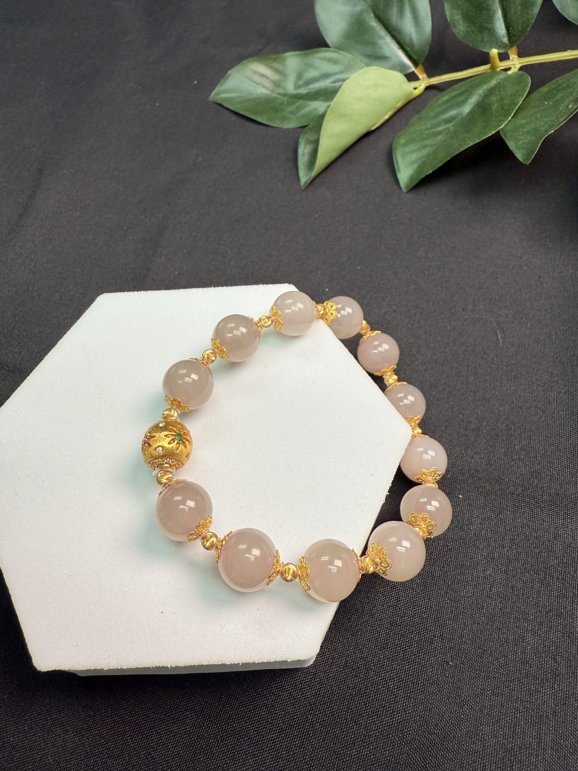 Composition: Centerpiece 10mm 18k gold bead with flower design (1), 10mm pink jade beads# (12), 5.8mm 18k gold flower-shaped spacer beads (7) and 3mm 18k gold cat-eye beads (13)