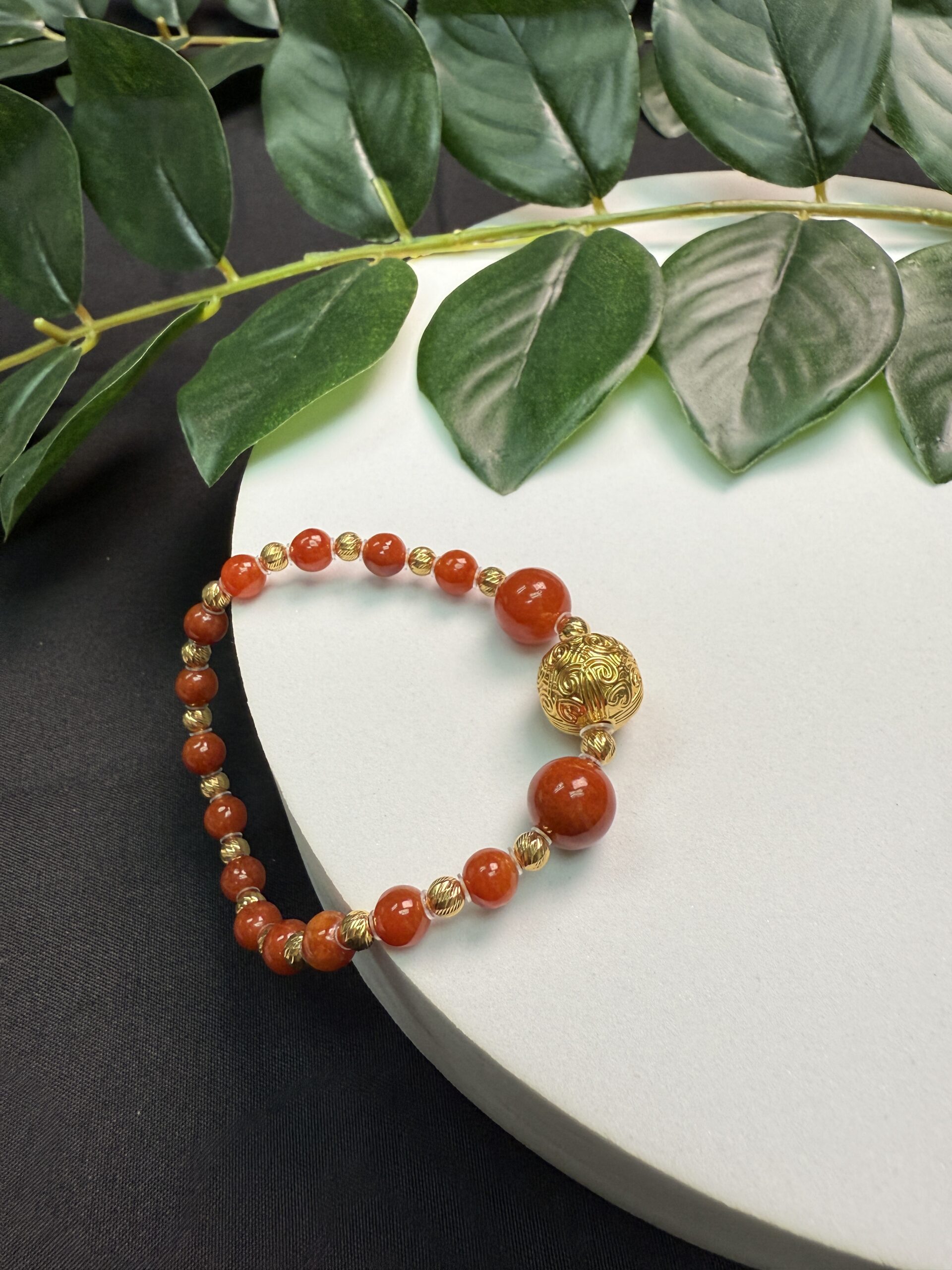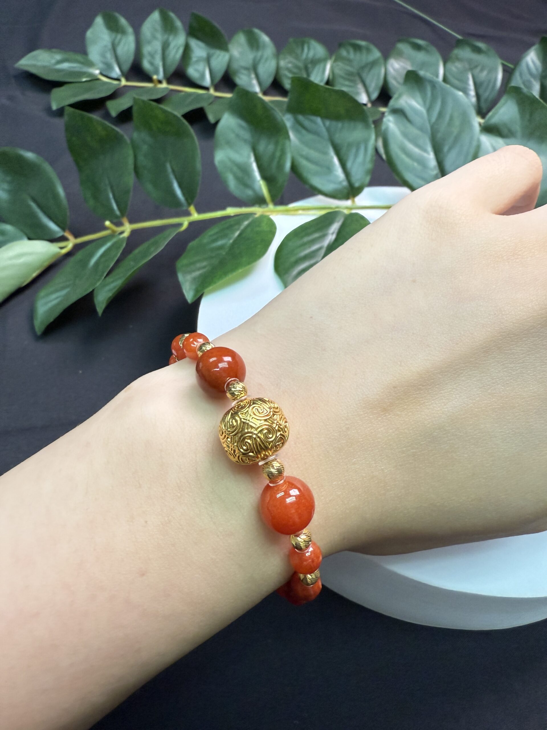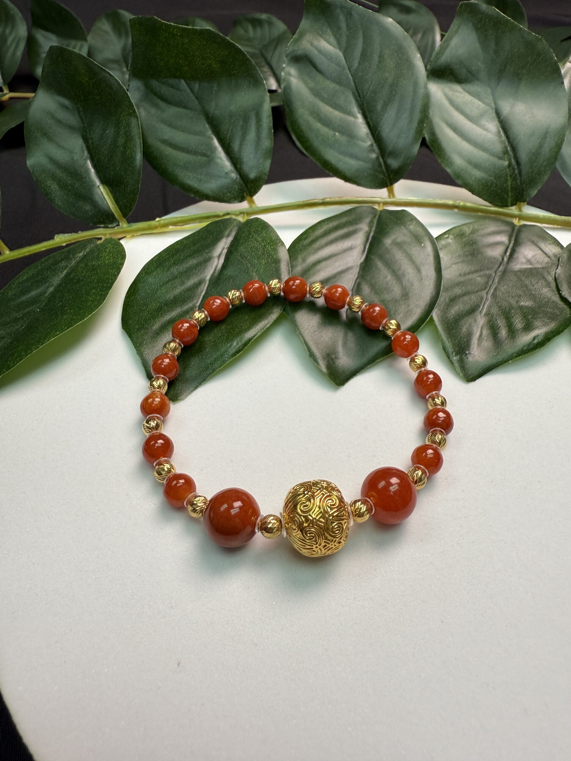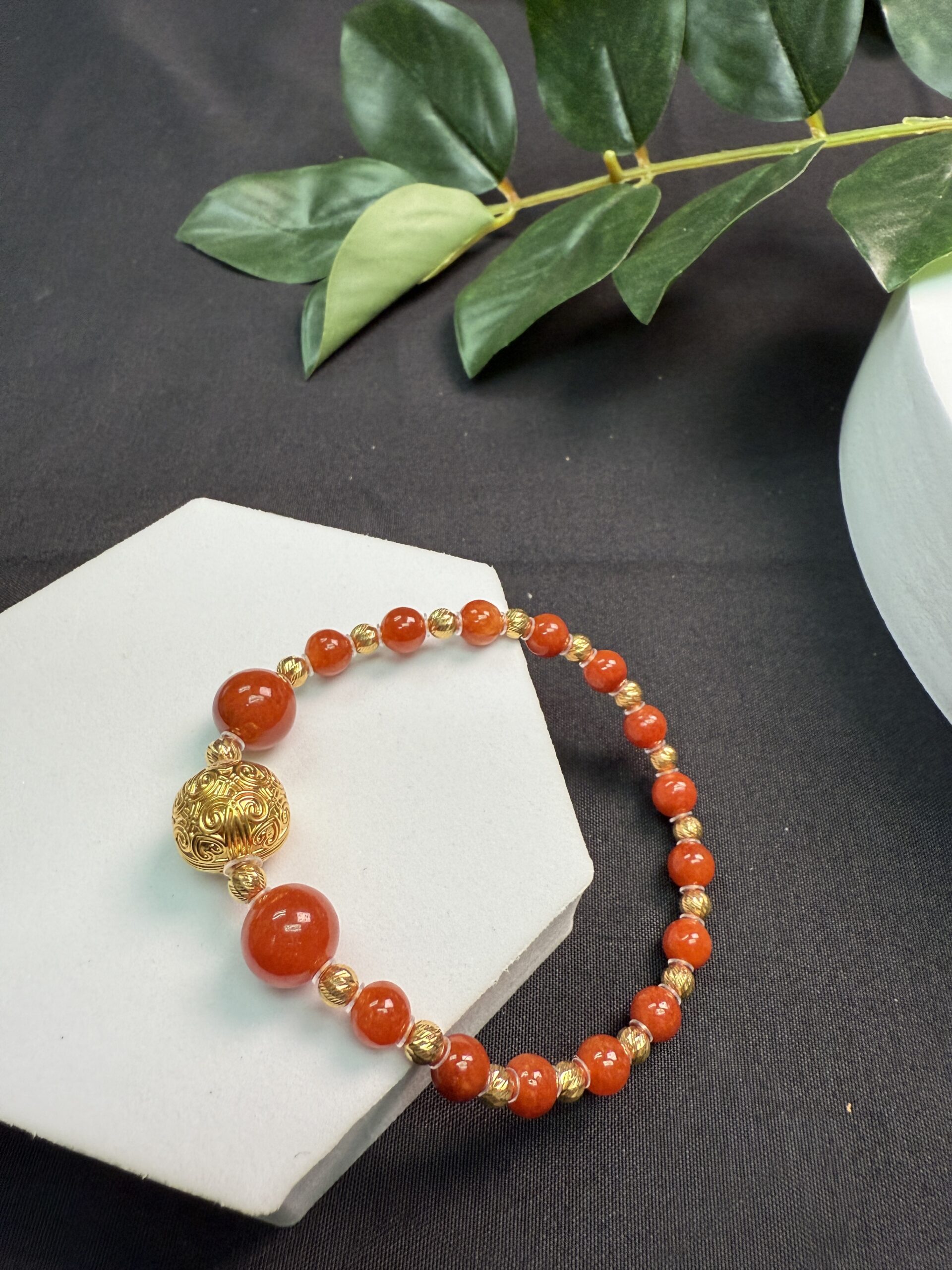 Composition: Centerpiece 12mm 18k gold square bead with “Floral Scroll Motif from the Tang Dynasty” measuring 11x12mm (1), 9.7mm red jadeite beads# (2), 6mm red jadeite beads# (14) and 4mm 18k gold shiny spacer beads (17)