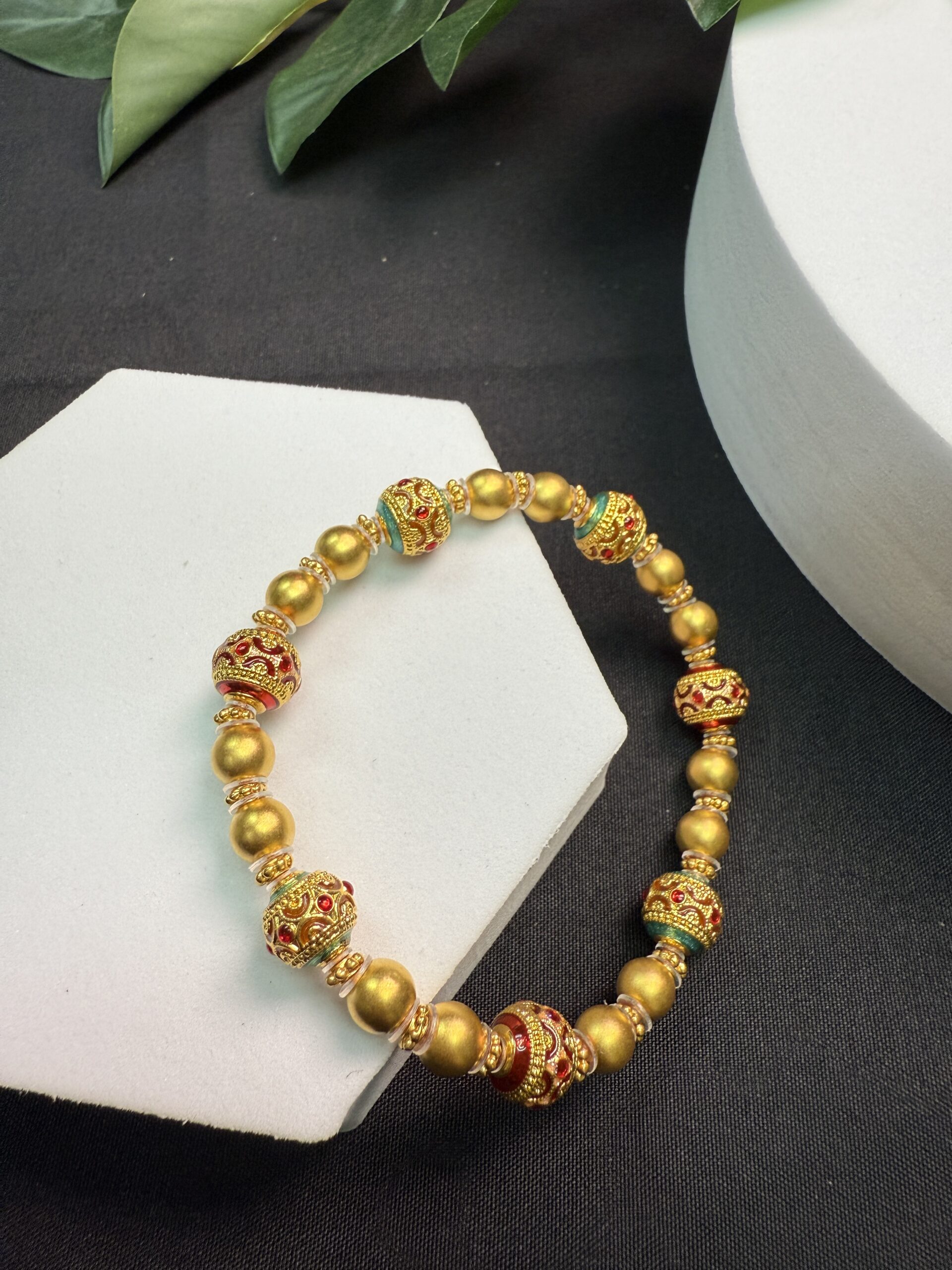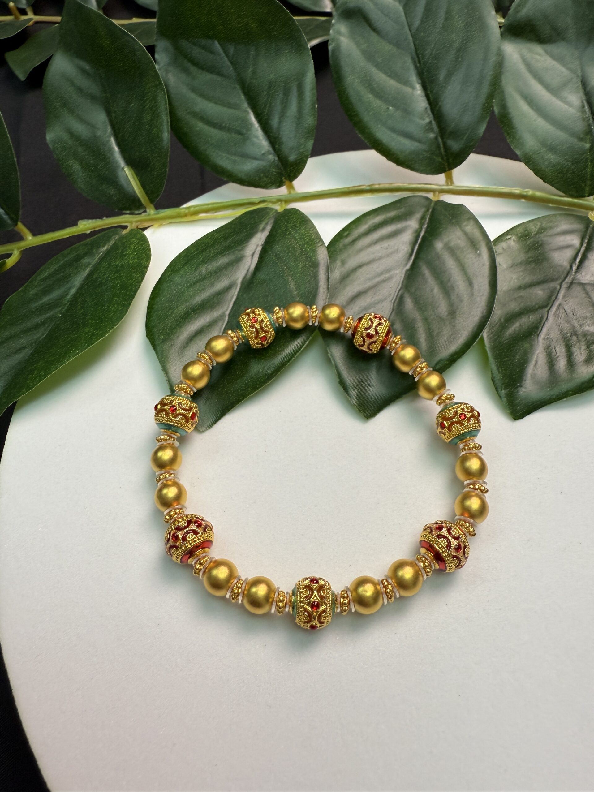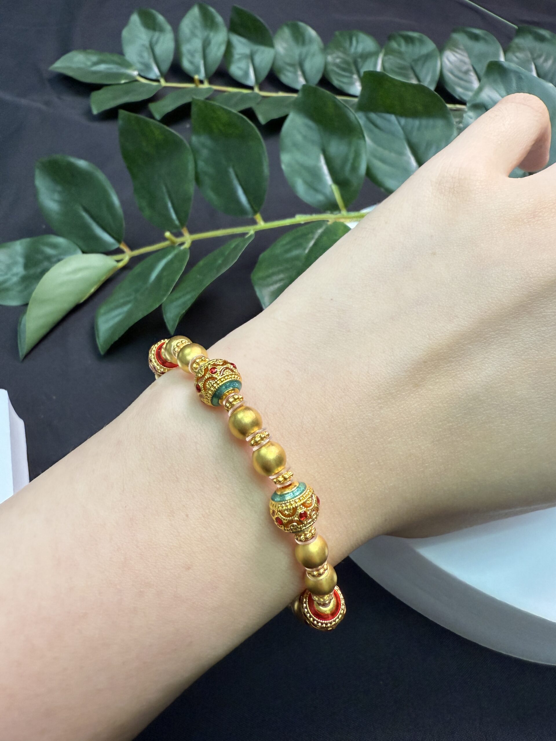 Composition: 24k gold green round beads measuring 8.5×8.2mm each (4), 24k gold red round beads measuring 8.5×8.2mm each (3), 6mm 24k gold beads (14) and 4mm 24k gold wheel beads (21)