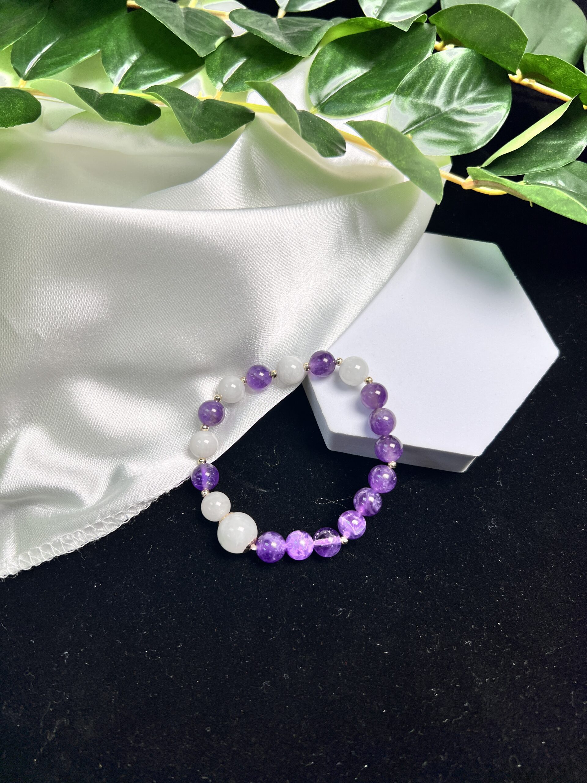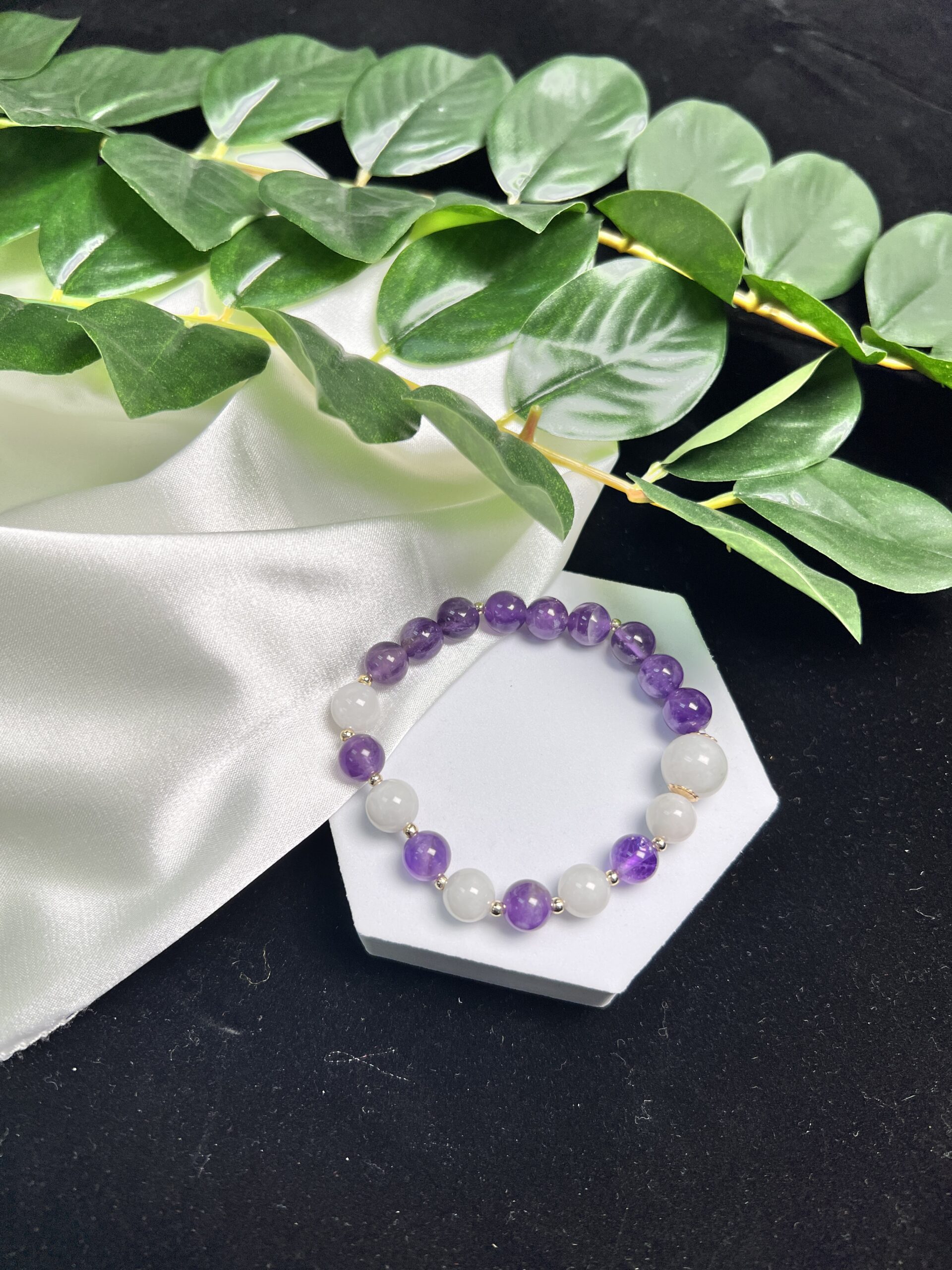 Composition: 12mm green floral jadeite bead# (1), 8.8mm white jadeite beads# (4), 8.5mm amethyst beads (13), 6mm gold-filled flower-shaped spacer beads (2) and 2.5mm 18k gold-plated spacer beads (11)