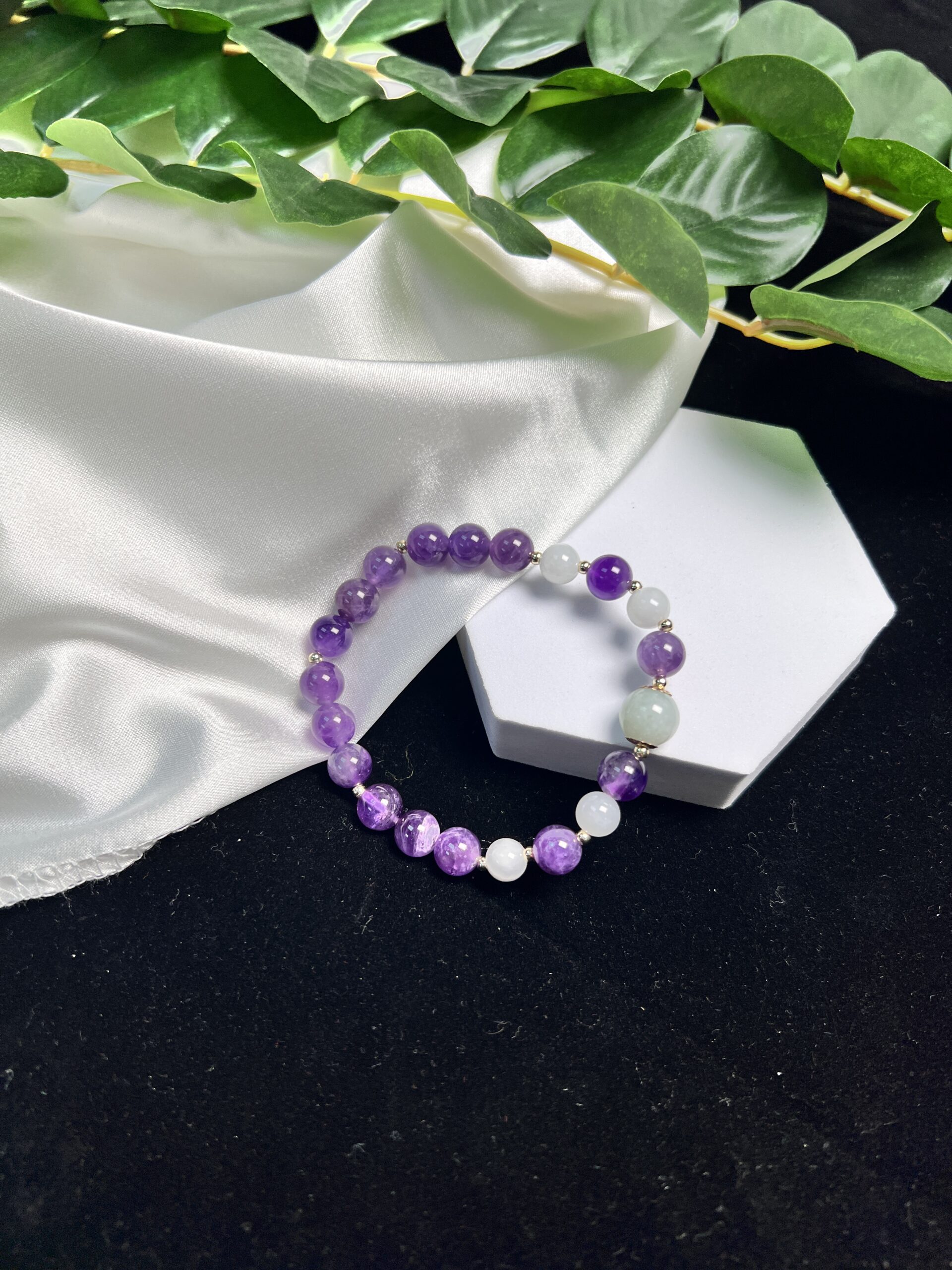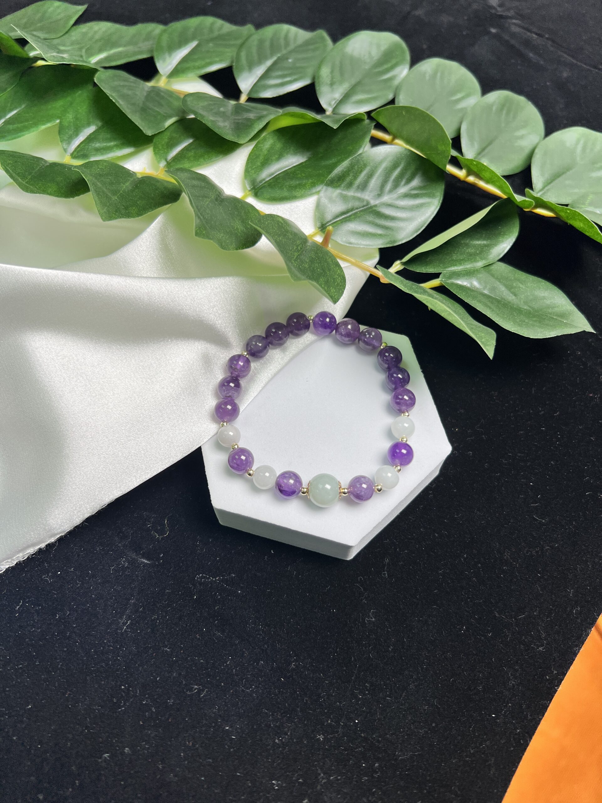Composition: 10.3mm light green jadeite bead# (1), 7.5mm white jadeite beads# (4), 8.5mm amethyst beads (16), 6mm gold-filled flower-shaped spacer beads (2) and 2.5mm 18k gold-plated spacer beads (12)