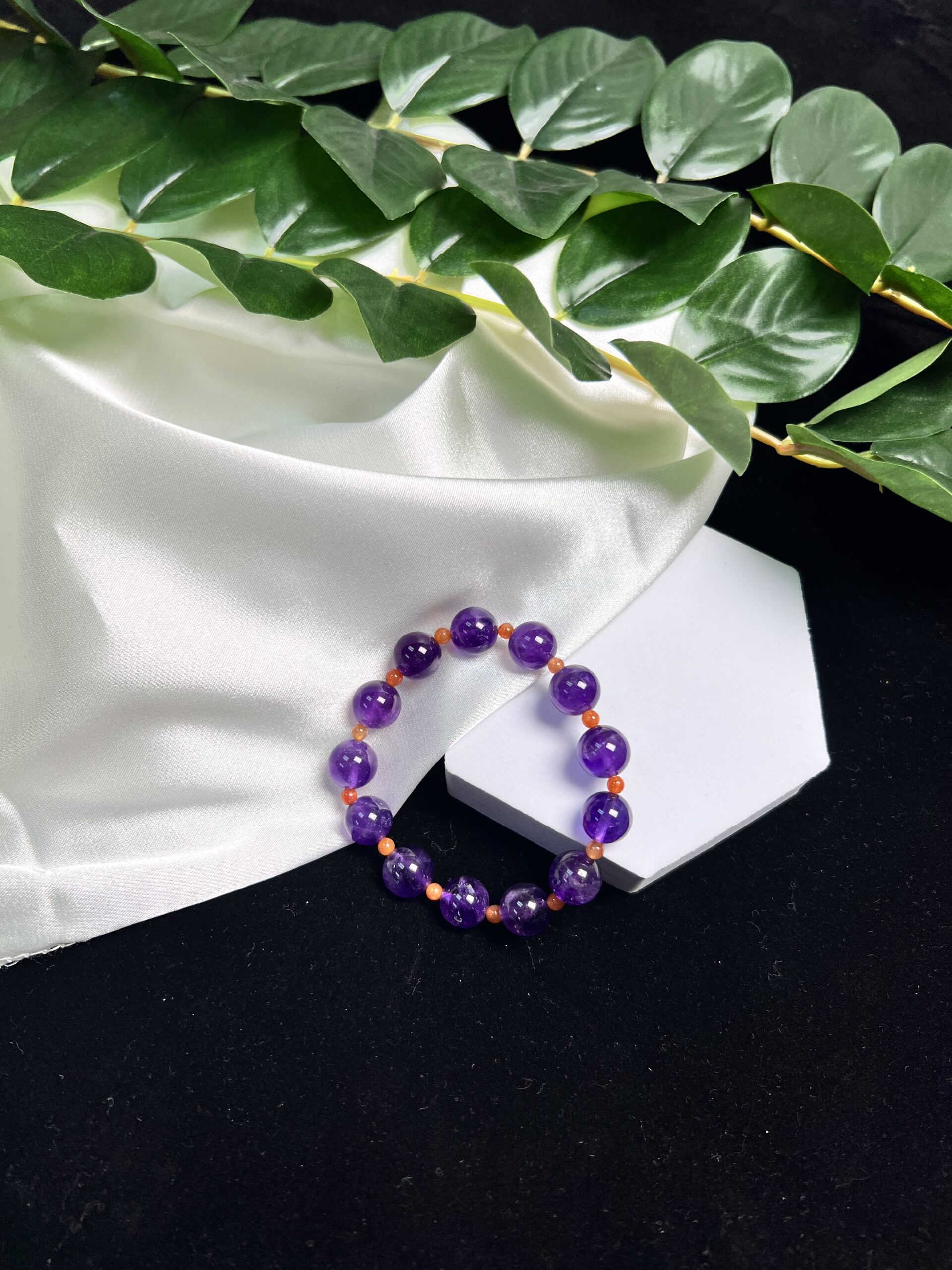 Composition: 3.7mm red jadeite beads# (13) and 10.3mm amethyst beads (13)