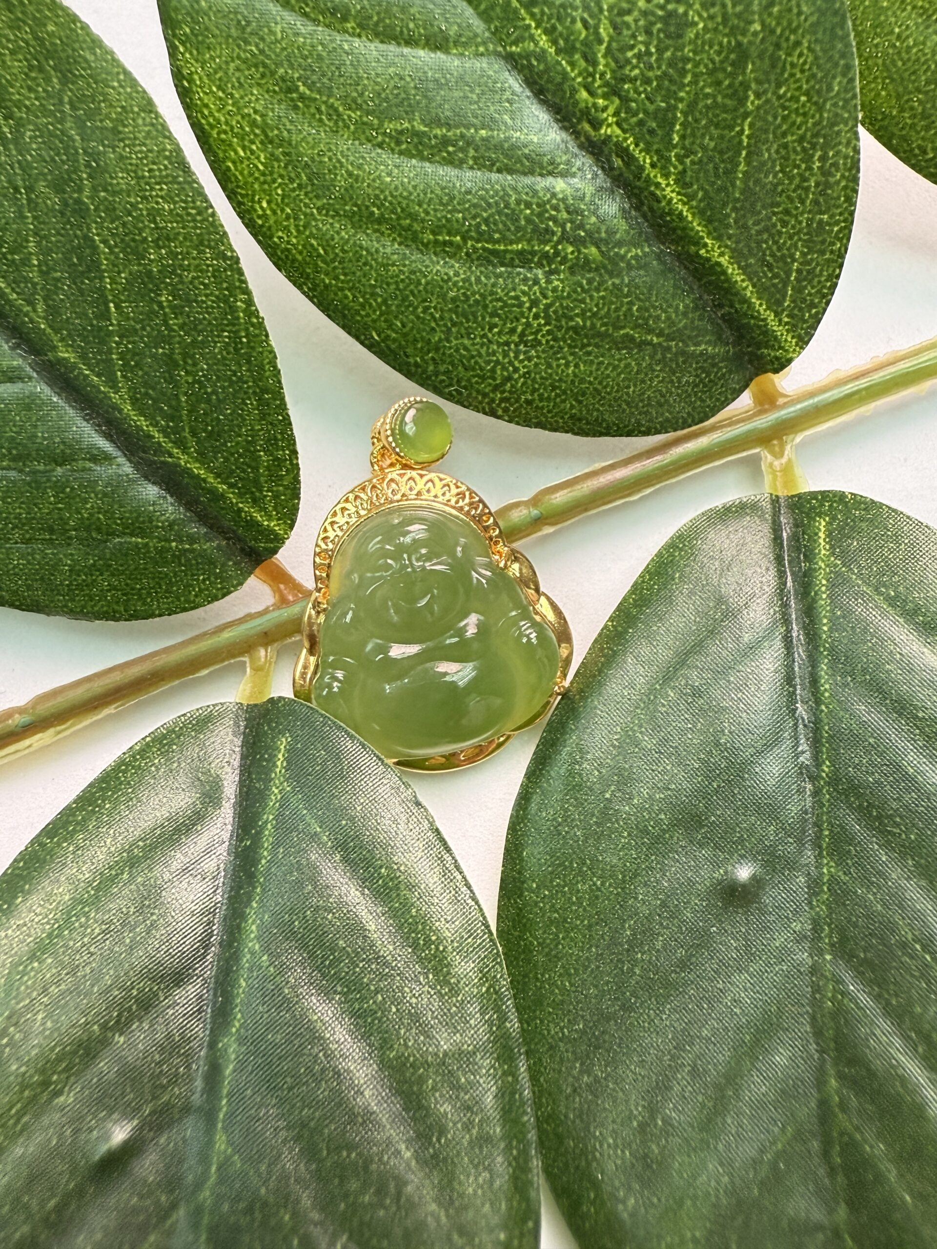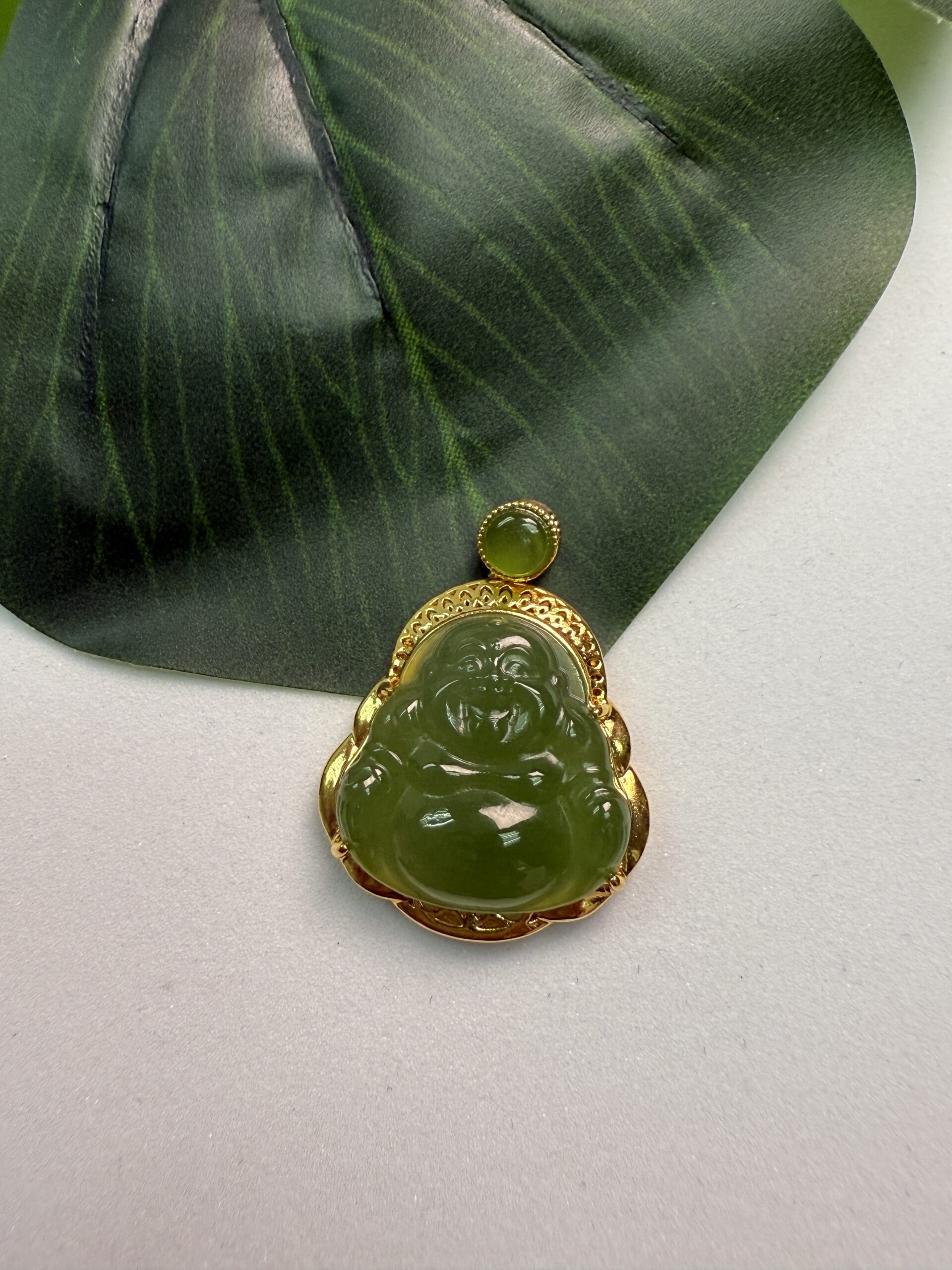 Composition: Laughing Buddha shape jade in 18k yellow gold frame measuring approximately 20.3×28.1×6.5mm