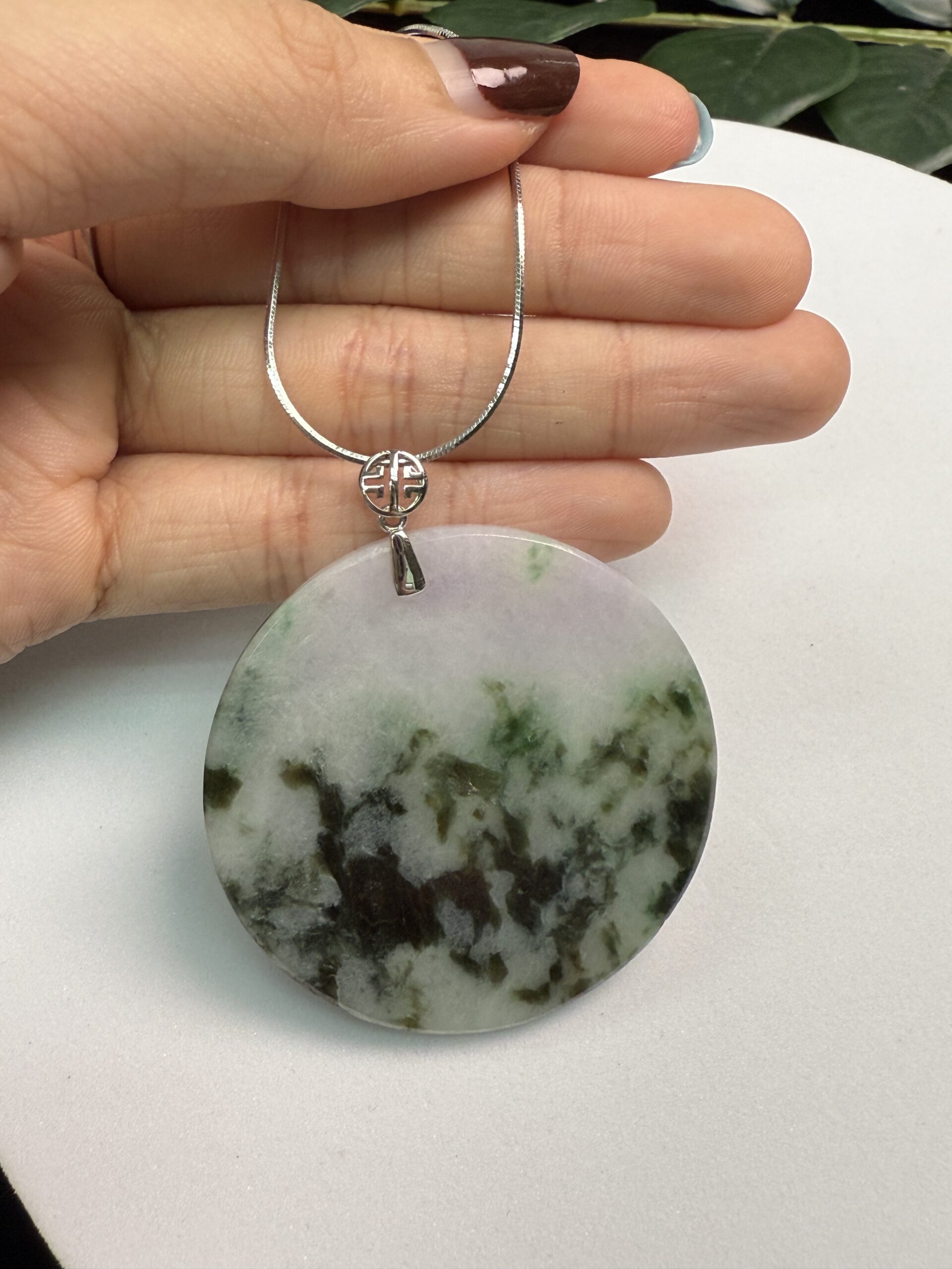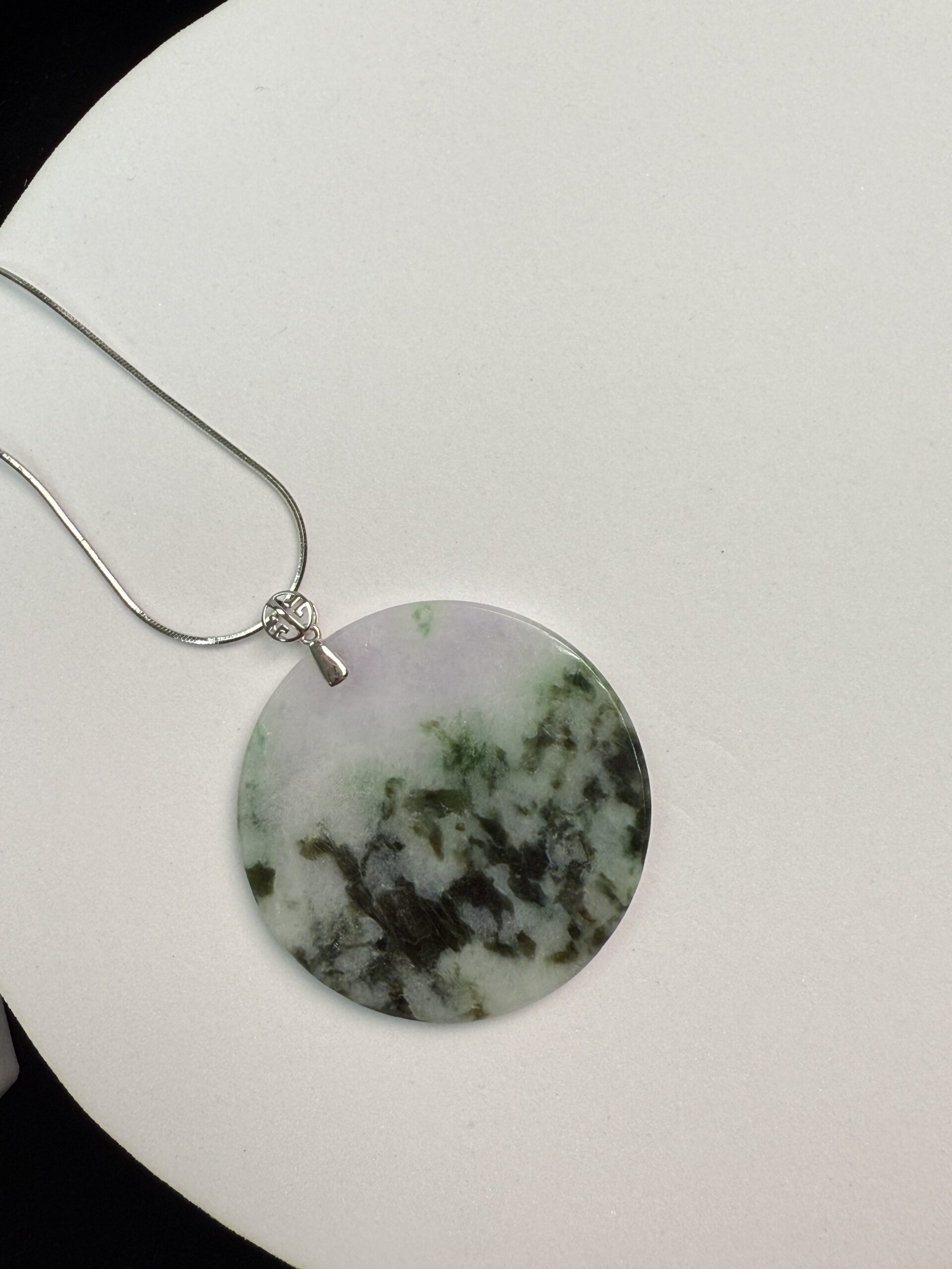 Composition: Round-shaped jadeite measuring approximately 49.02×3.92mm with 18k white gold bail