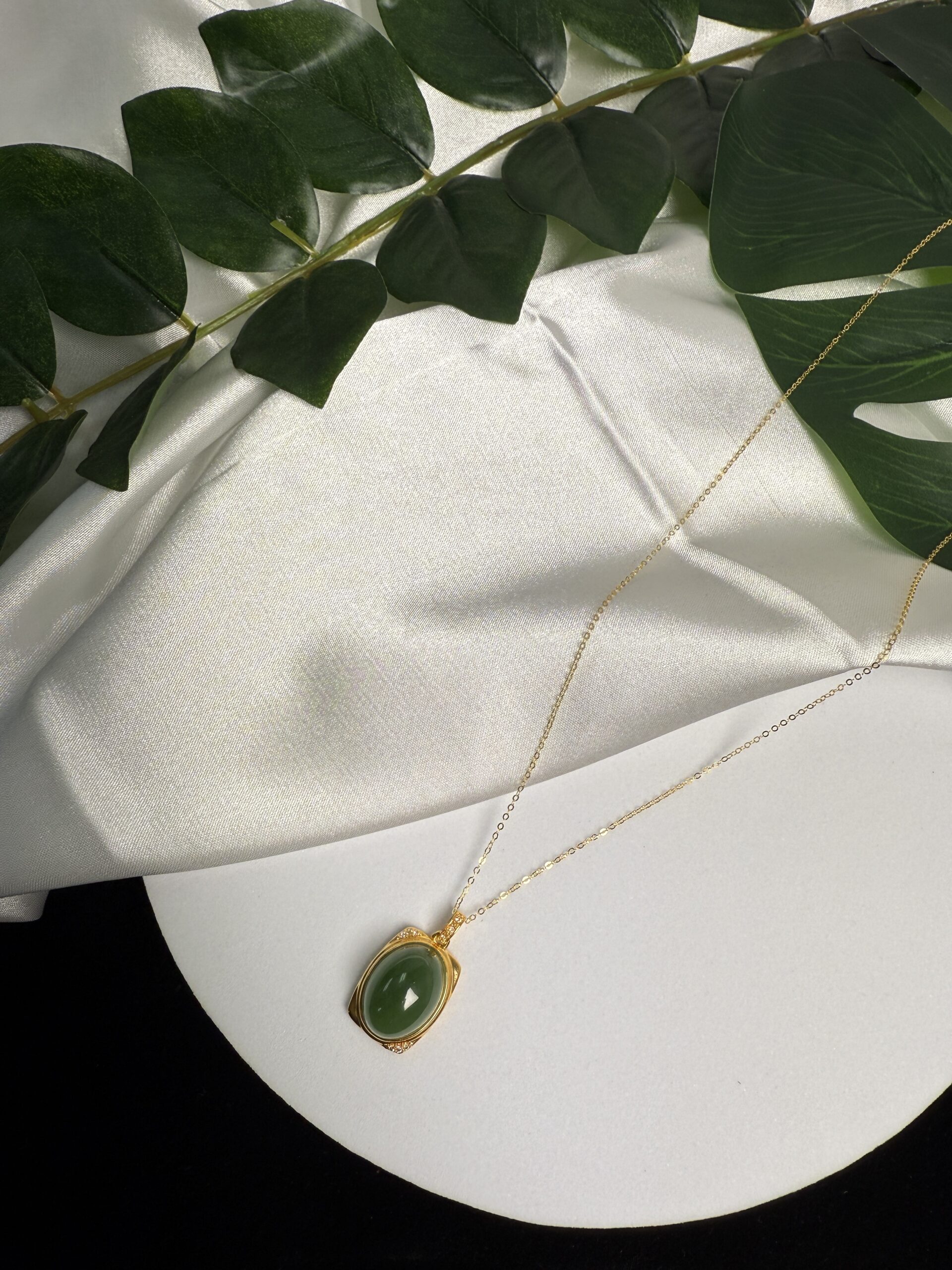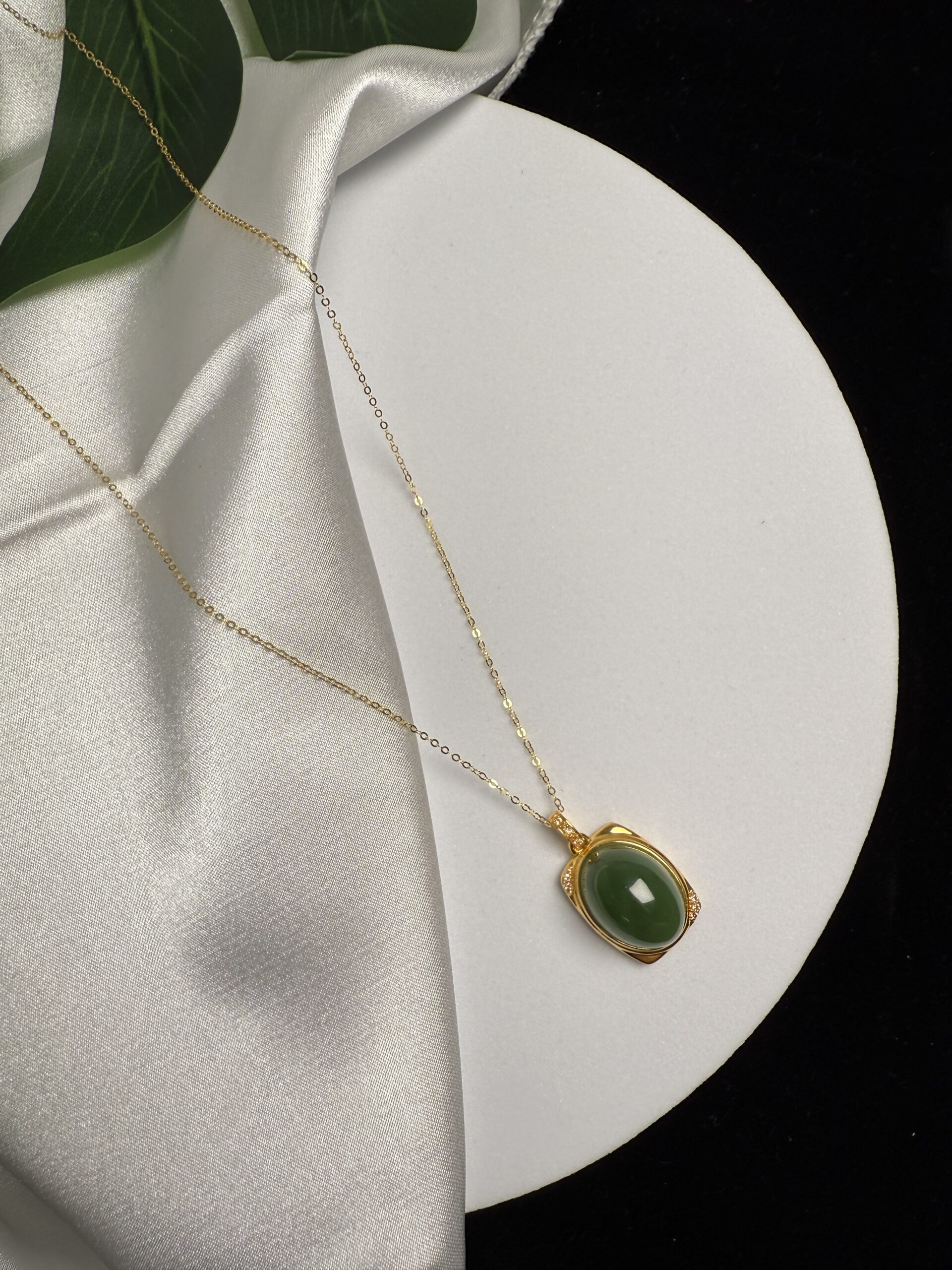 Composition: Cabochon shape jade in 18k yellow gold frame measuring approximately 14.8×25.1×11.4mm