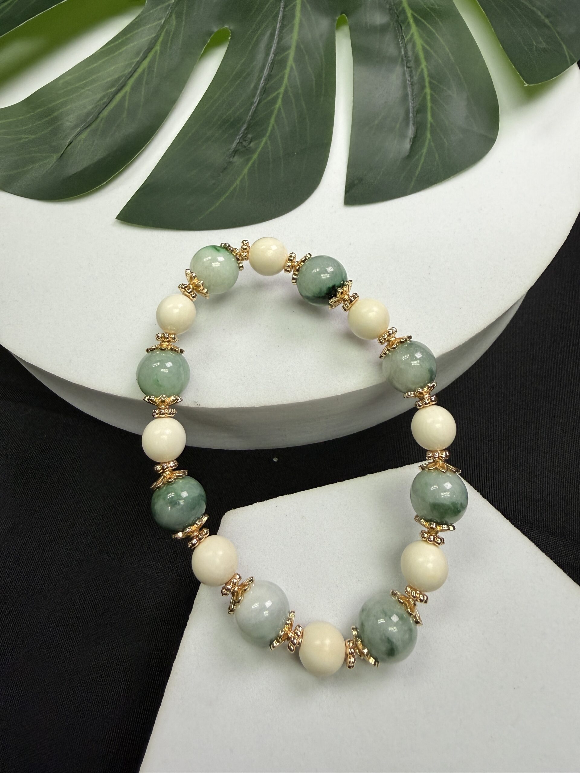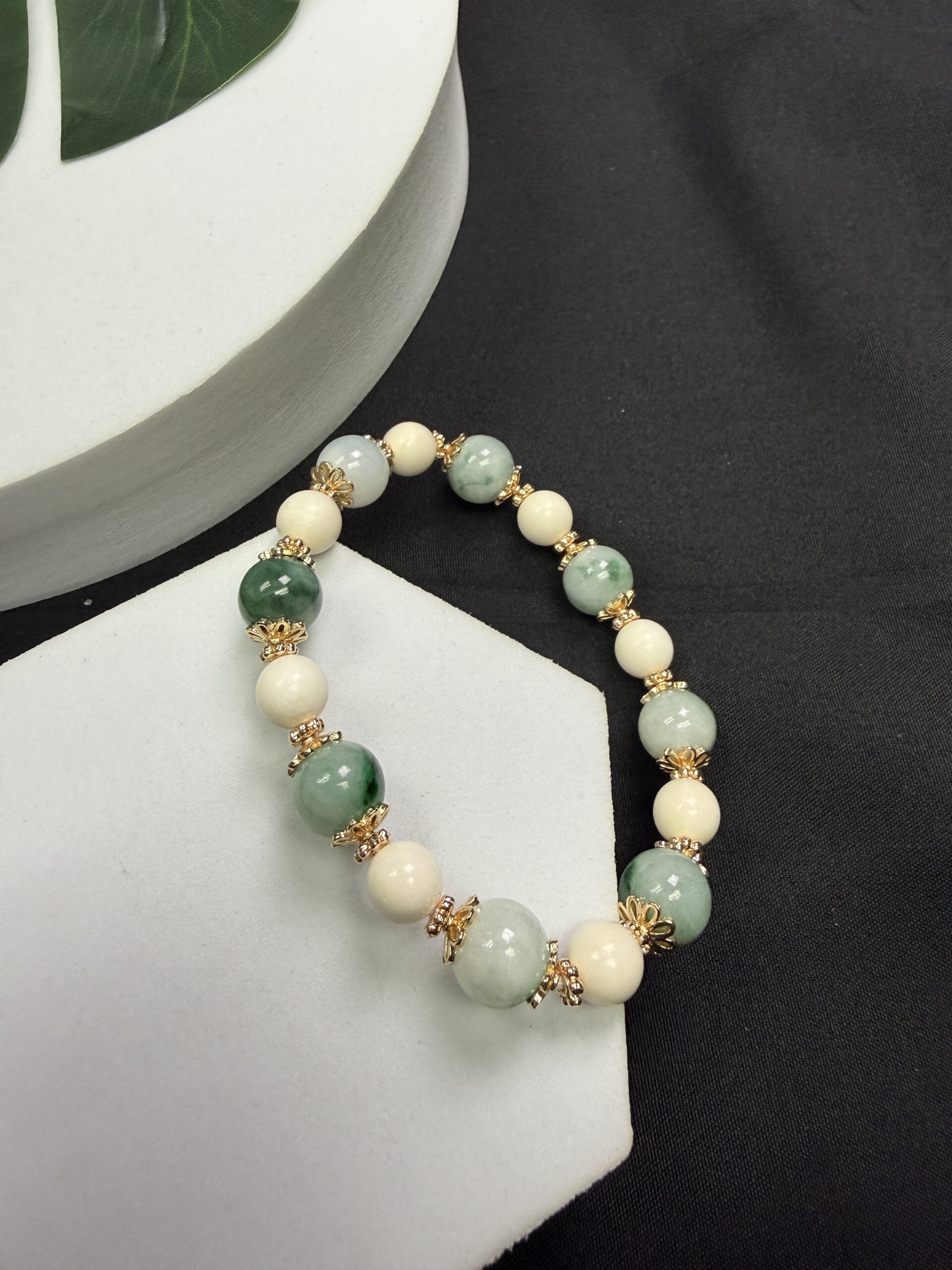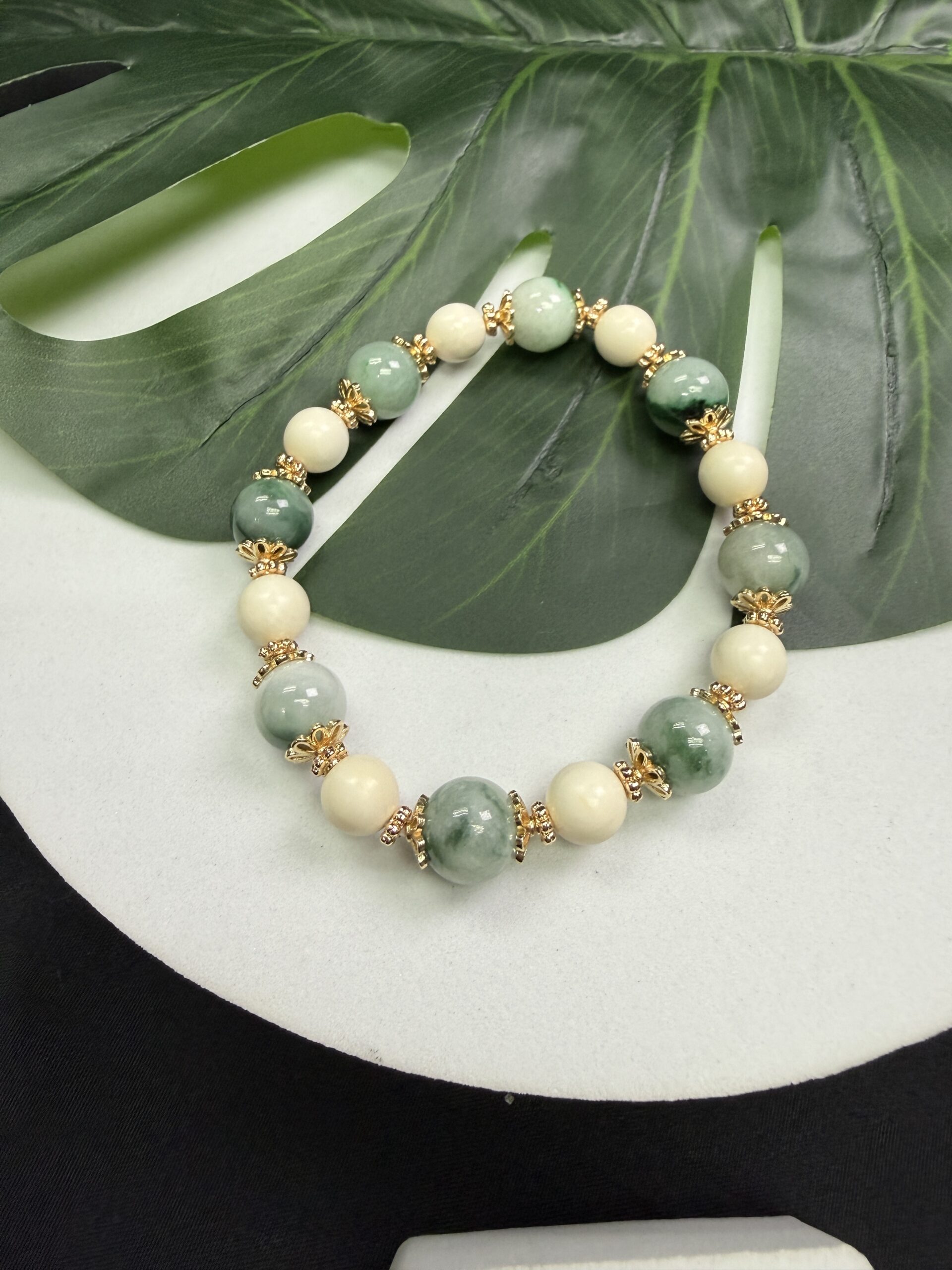 Composition: 10mm green floral jadeite beads# (8), 8mm ivory beads (8), 7mm 14k gold-filled flower-shaped spacer beads (16) and 4mm 14k gold-filled spacer beads (16)