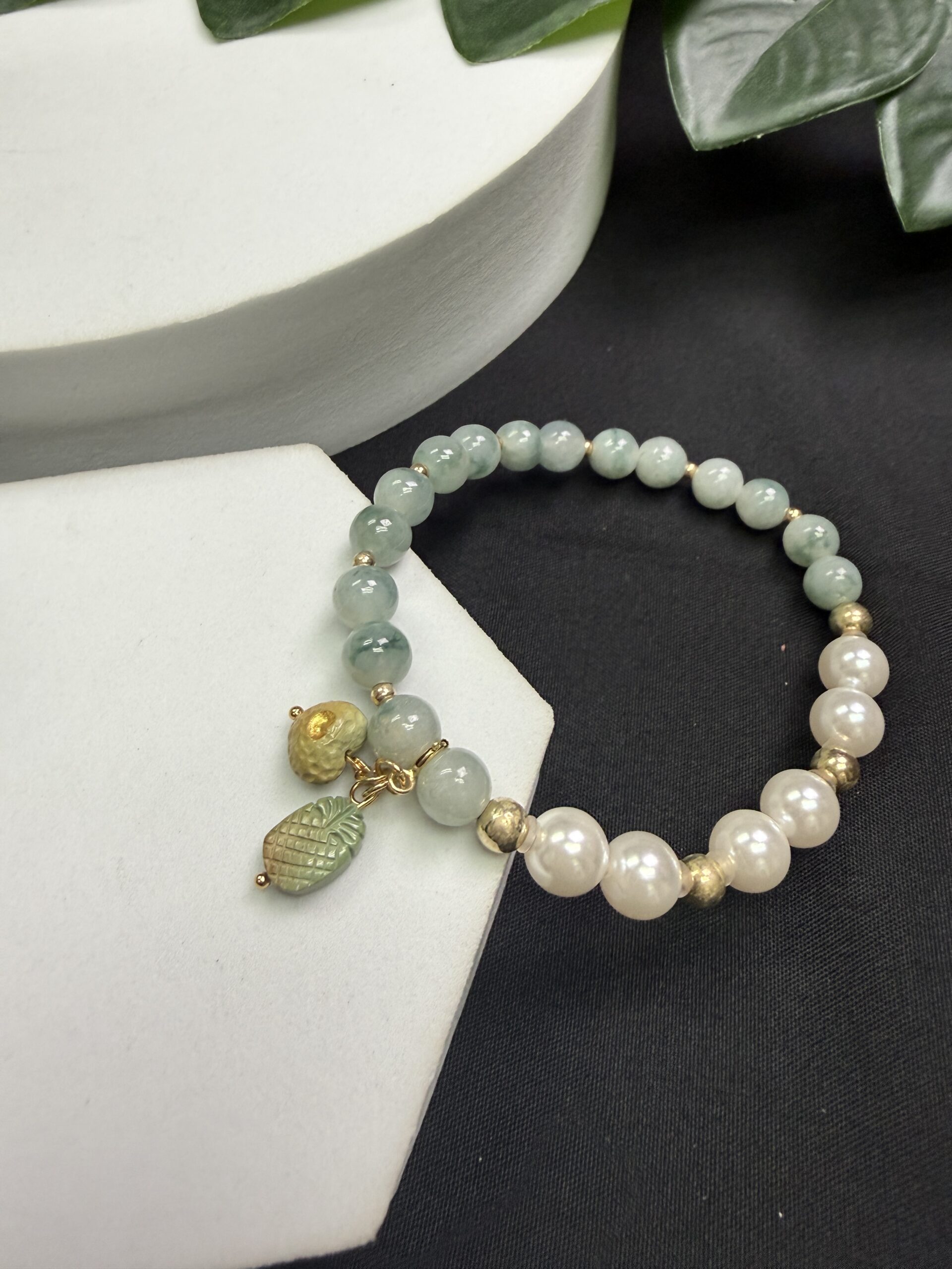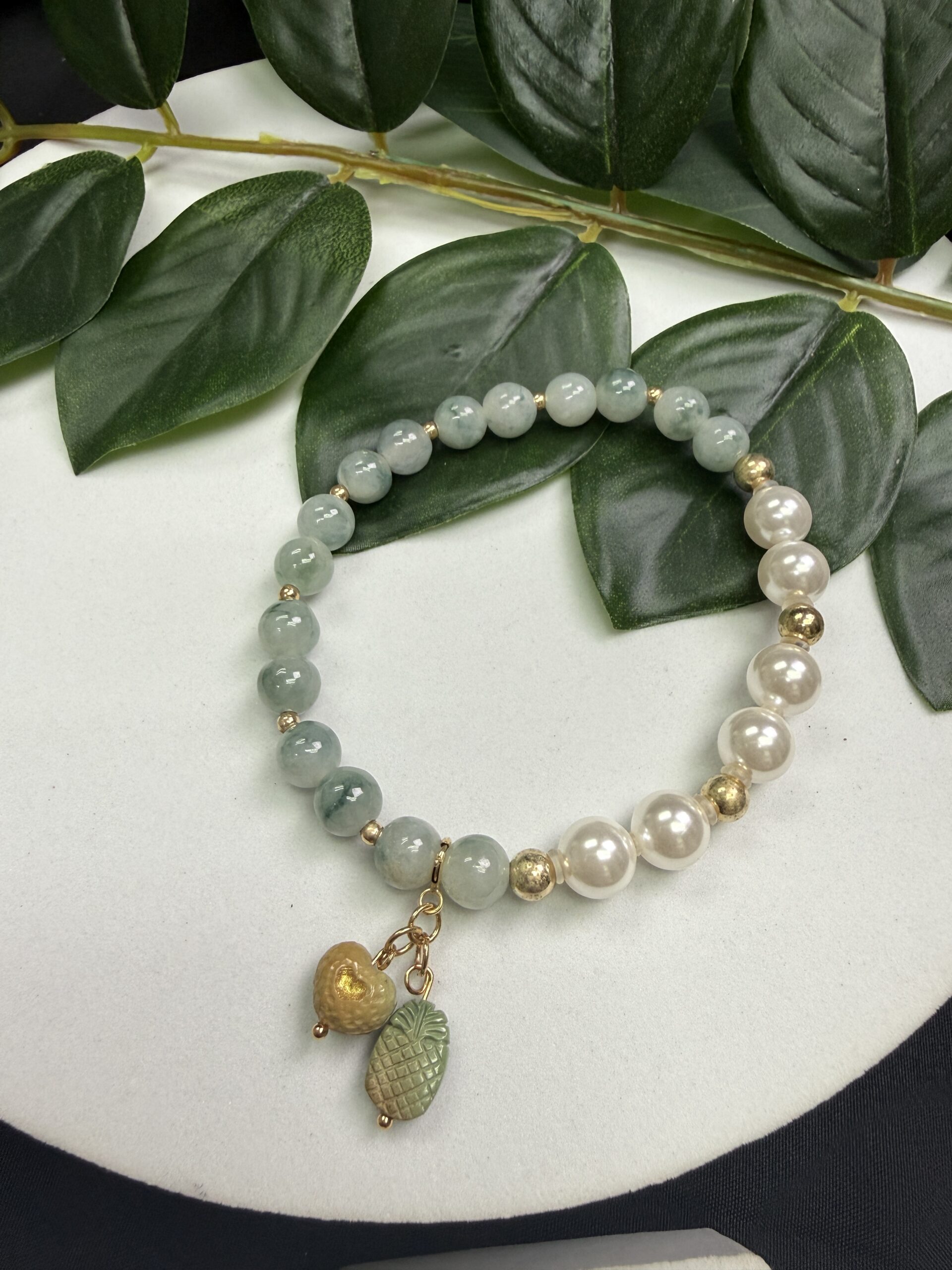 Composition: 7mm green floral jadeite beads# (16), 8mm white shell beads (6), a twin turquoise charm with strawberry form measuring 8.5x7x5.3mm and pineapple form measuring 7.1x10x3.7mm (1), 5mm 14k gold-filled spacer beads (4) and 2.5mm 14k gold-filled spacer beads (8)