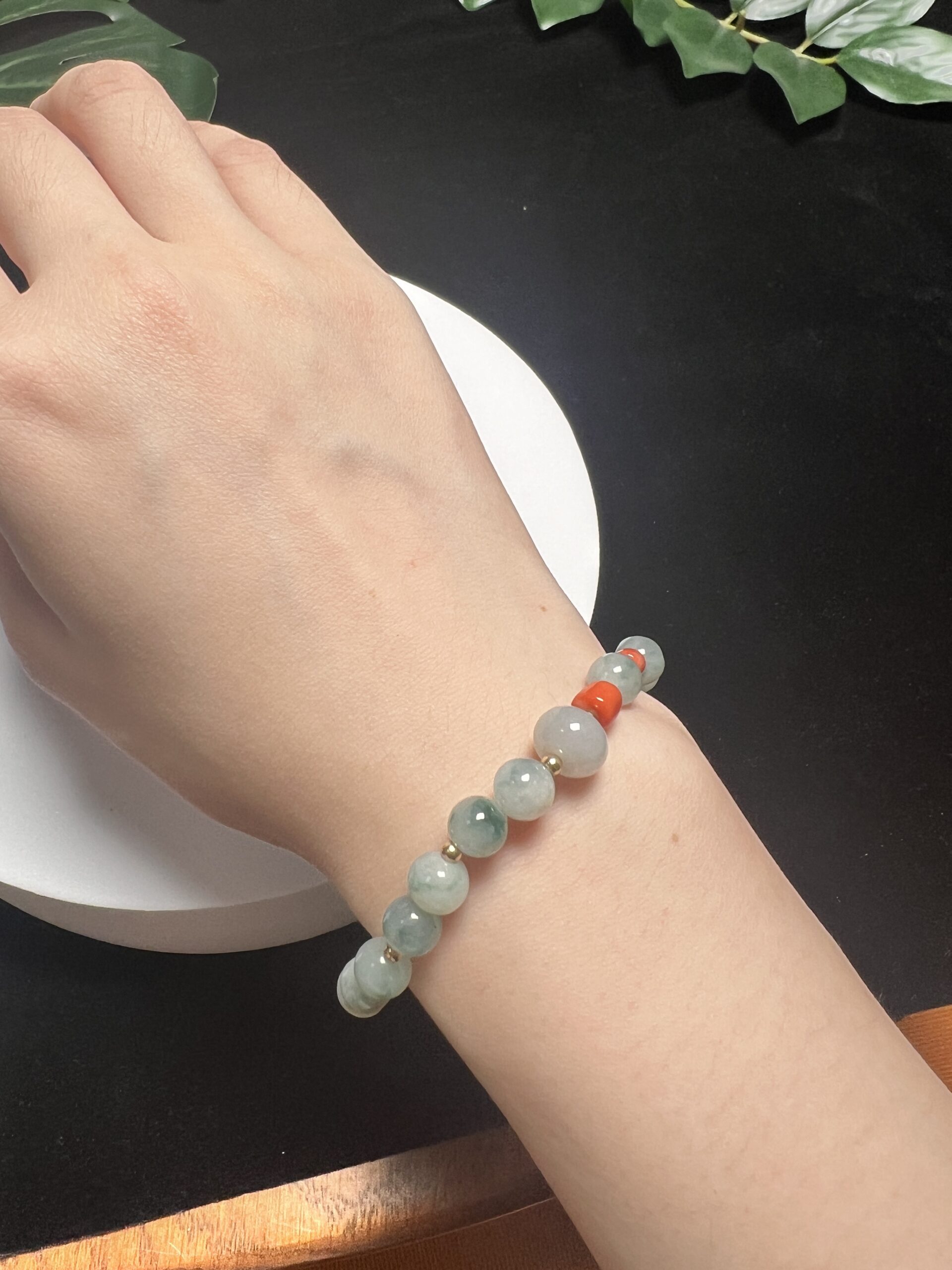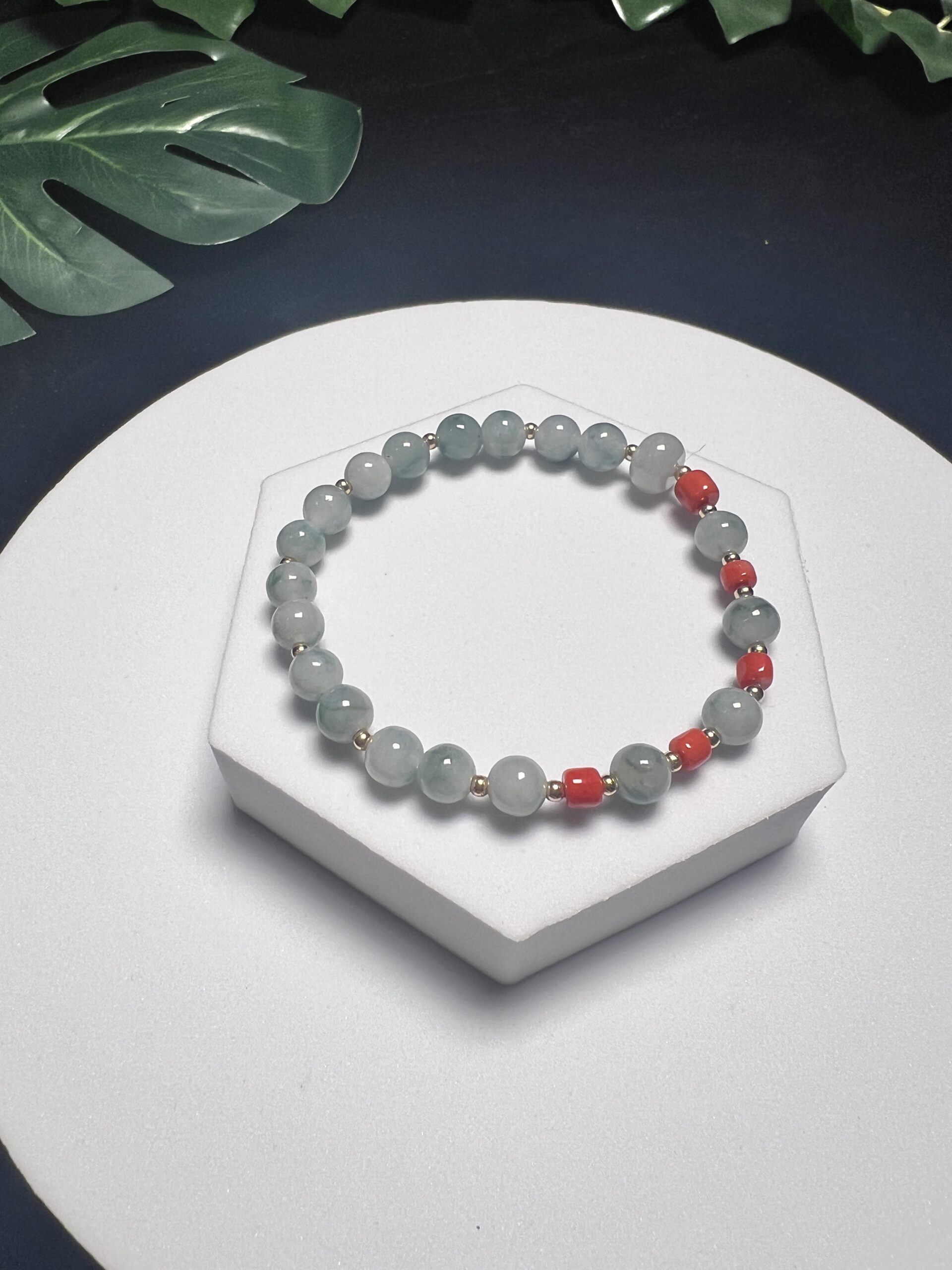 Composition: 9mm ice-type green abacus jadeite bead# (1), 7mm green floral jadeite beads# (19), 4.5mm straight cut coral beads# (5) and 2.5mm 14k gold-filled spacer beads (18)