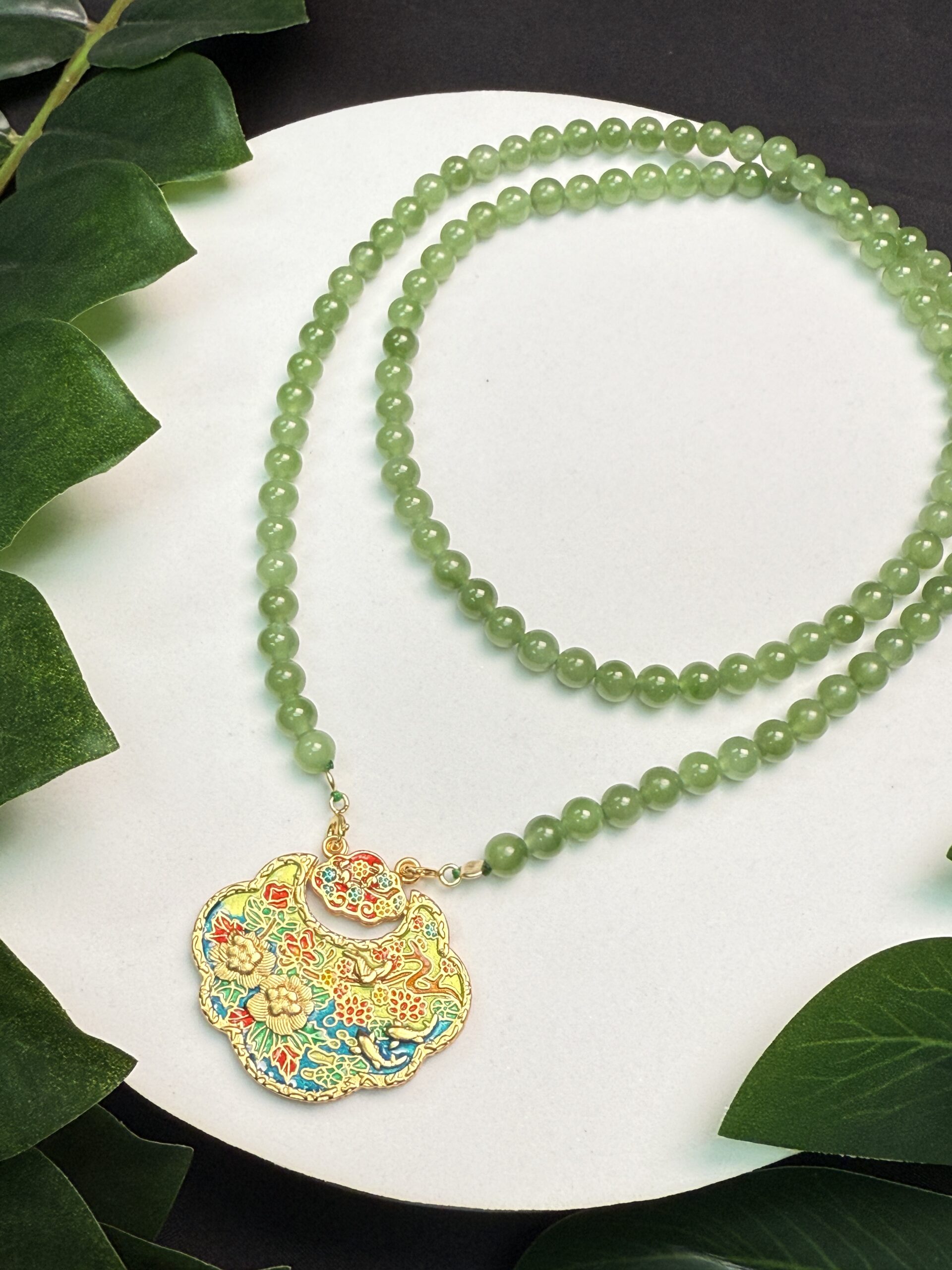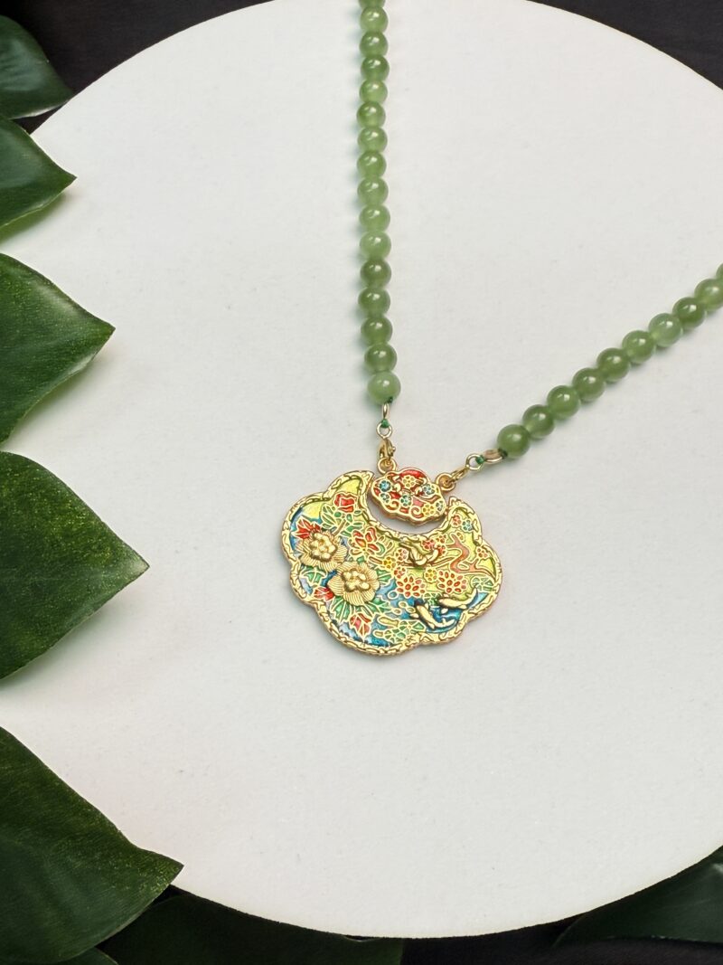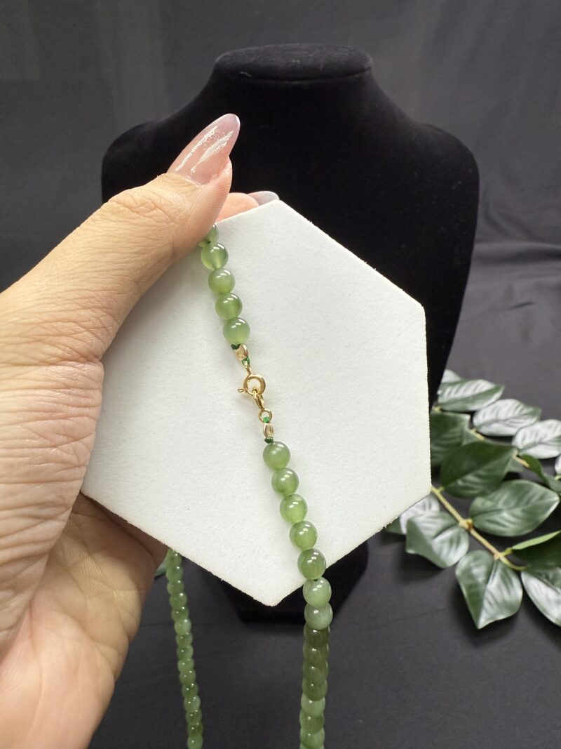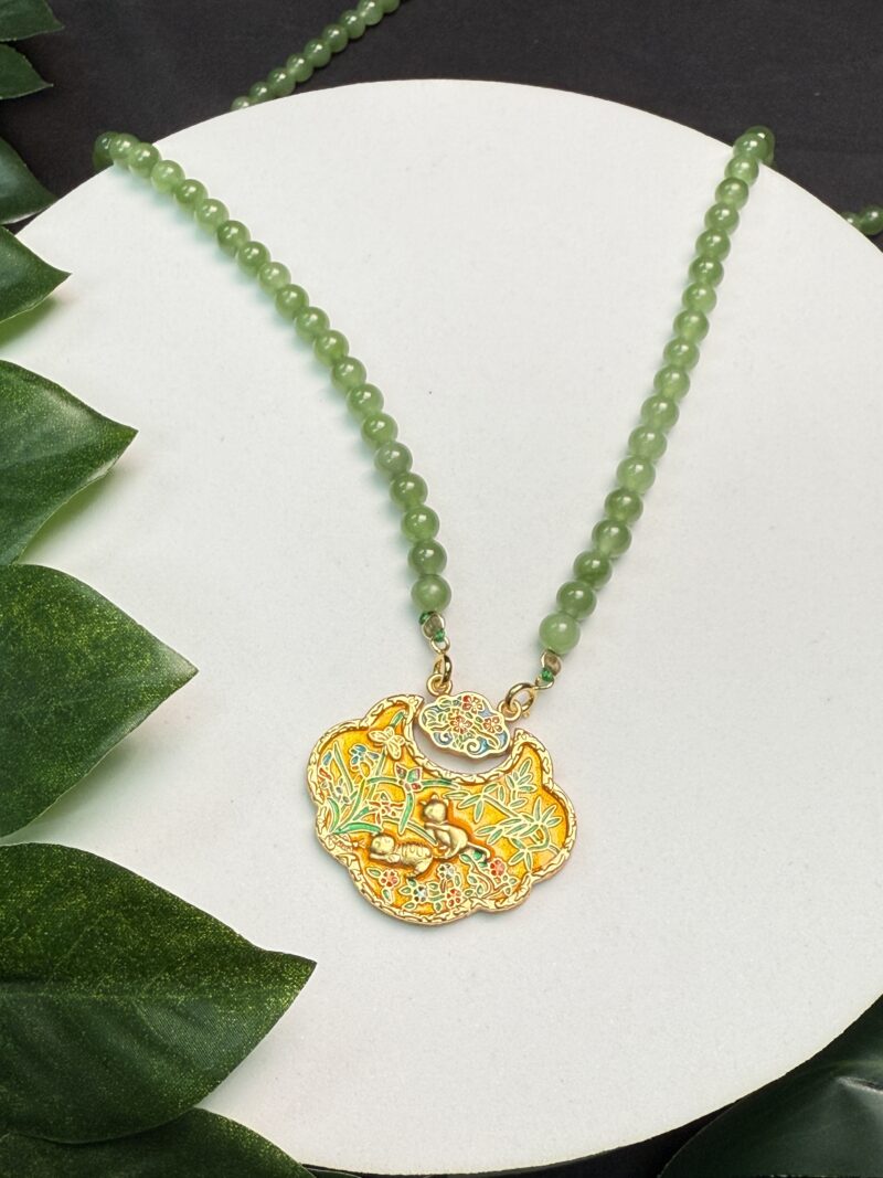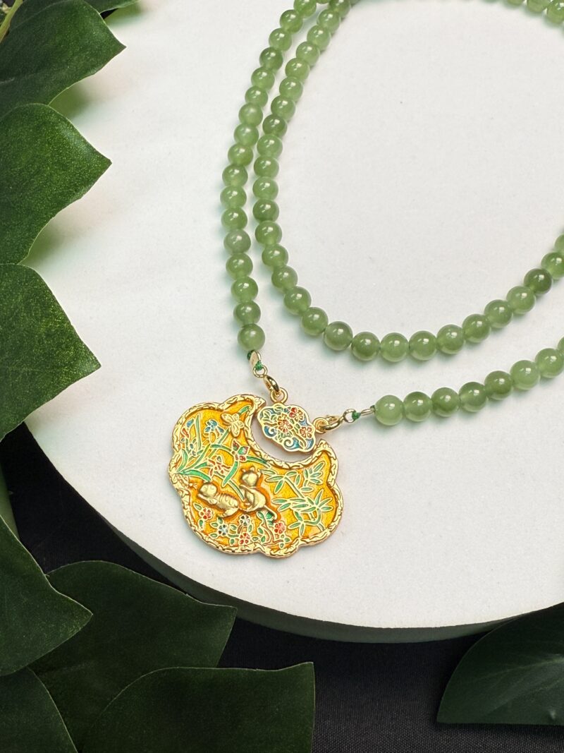 Composition: 6mm ice-type apple green nephrite jade beads (108) and a free gift of double hook gold-plated “Lotus and Fish” with “Two Mouse” lock pendant measuring 36.6×32.8×3.5mm (1)