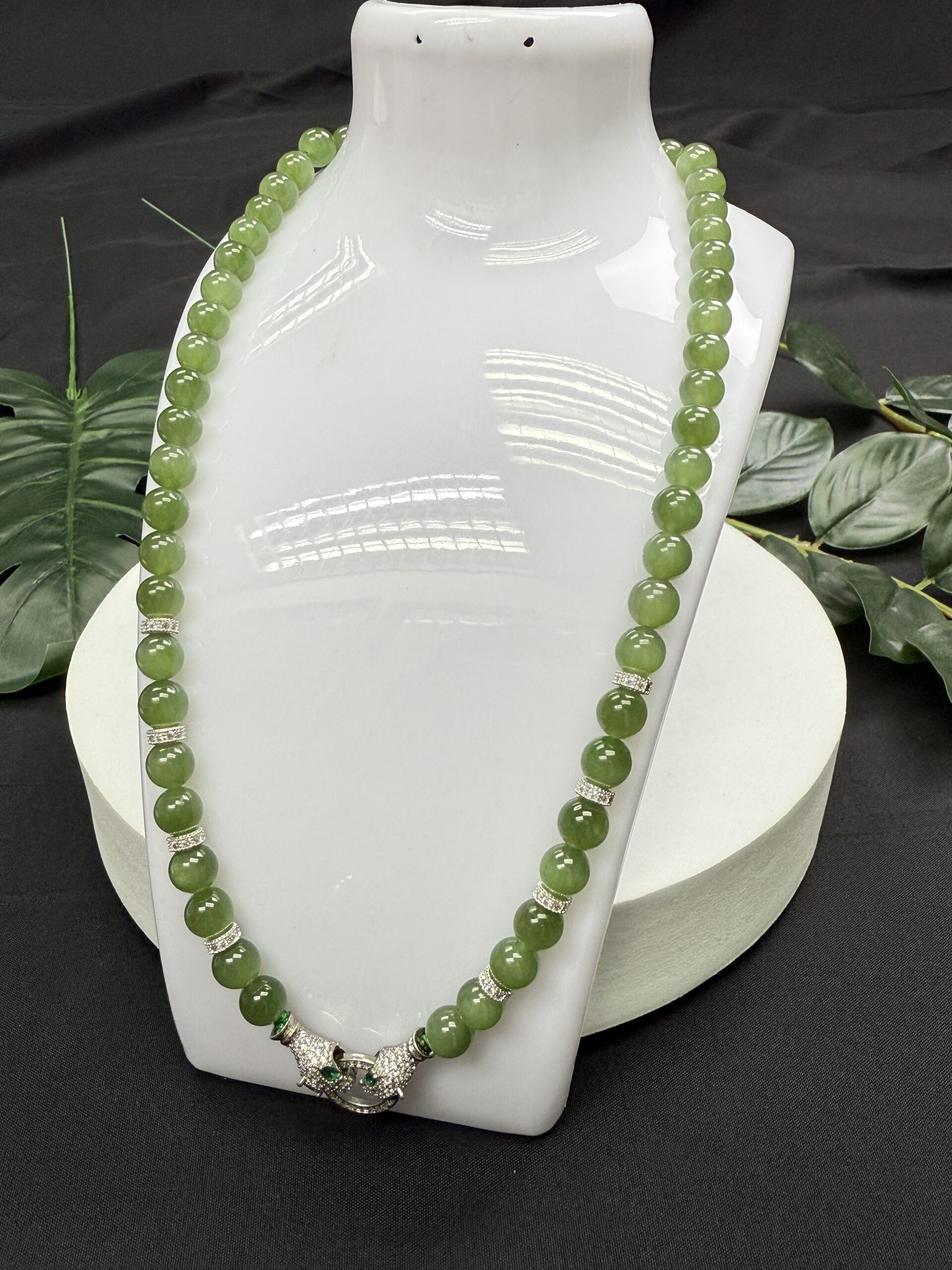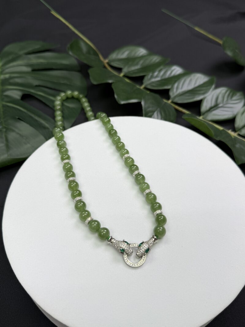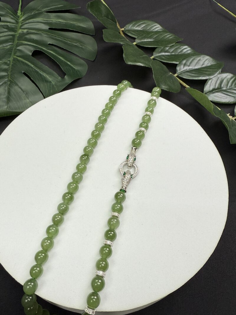 Composition: 7.8mm ice-type apple green nephrite jade beads (56) with 18k filled gold serpent-designed buckle (1) and 6mm 14k filled gold cubic zirconia spacers (8)