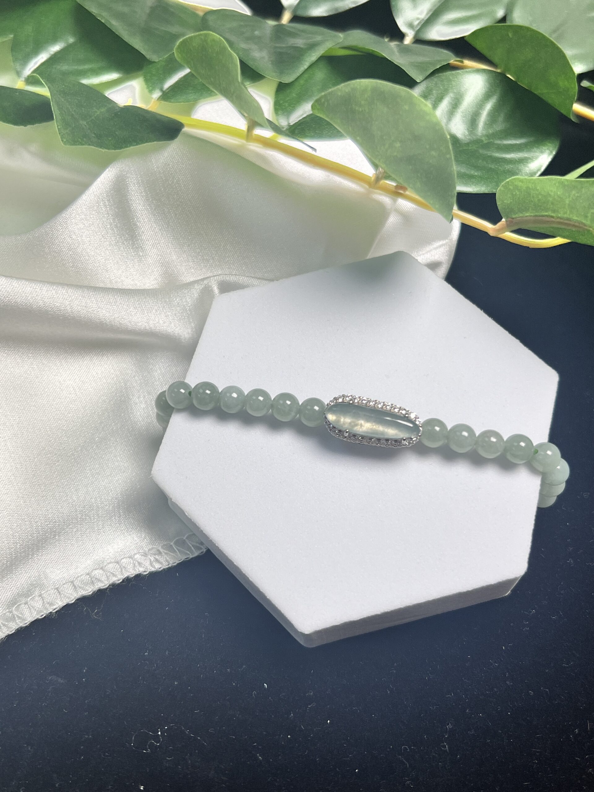 Composition: Ice-type green melon-shaped jadeite in sterling silver inlaid zircon frame measuring 20.3×9.6×8.8mm# (1) and 6mm ice-type green jadeite beads# (30)