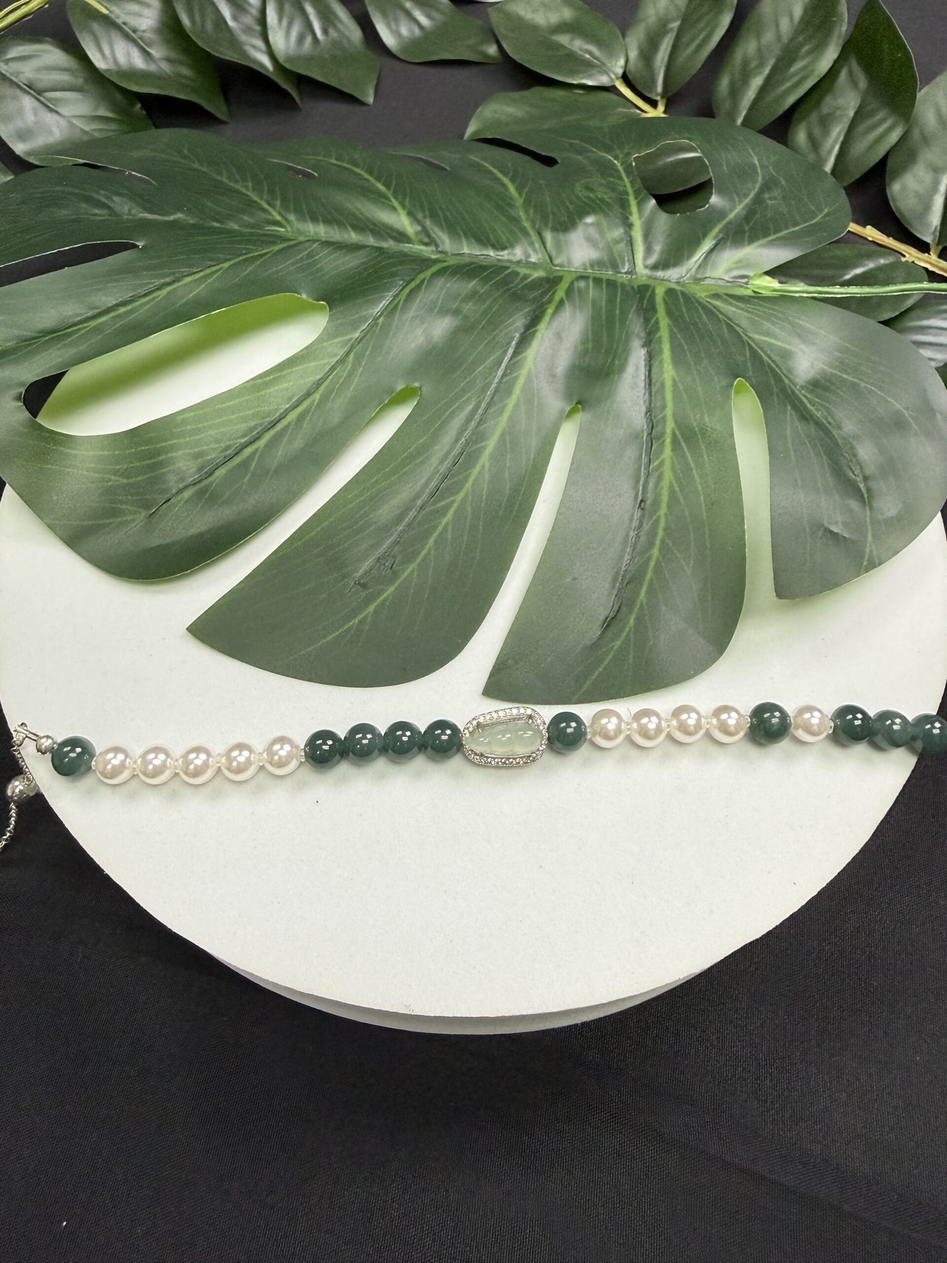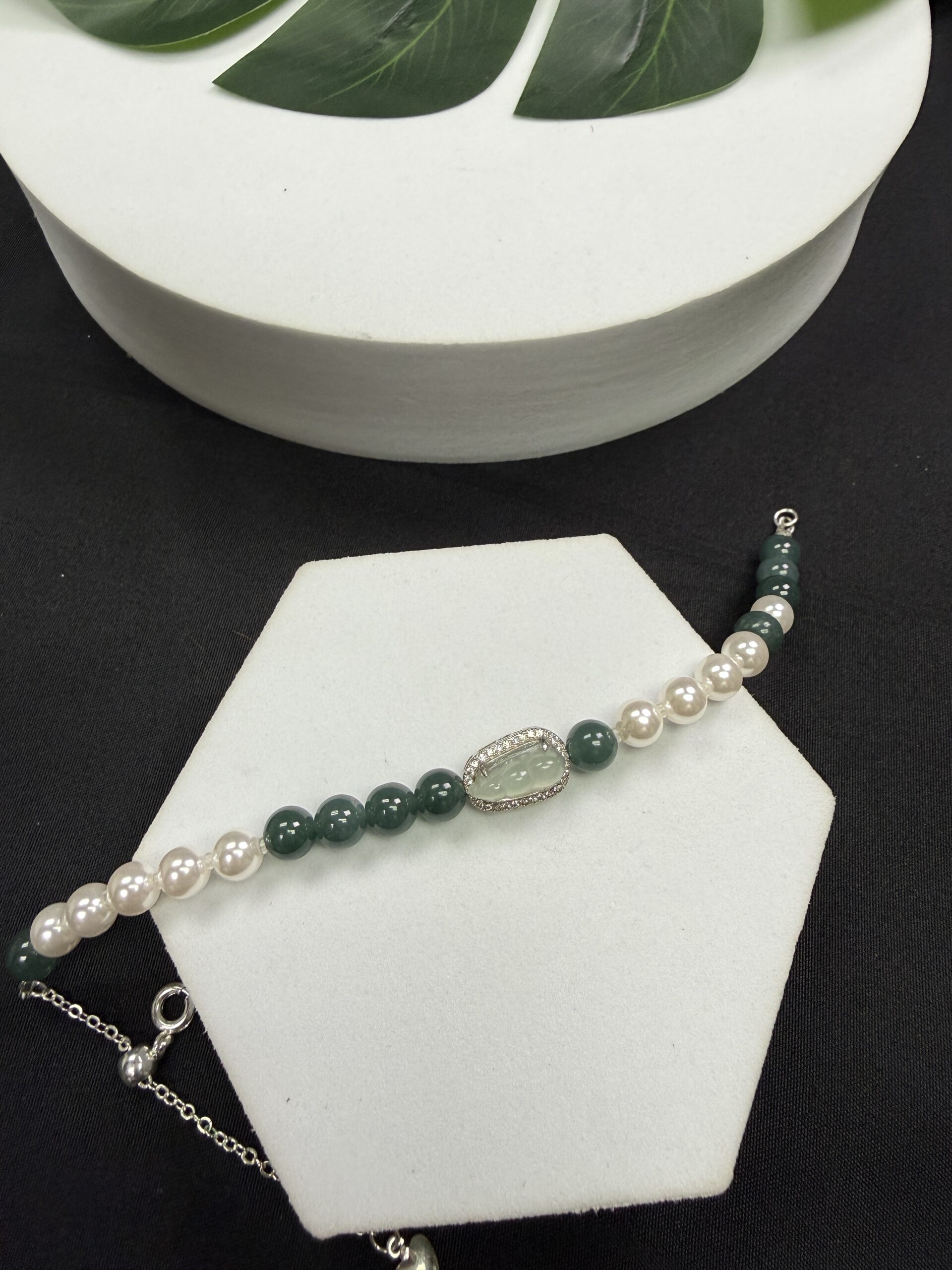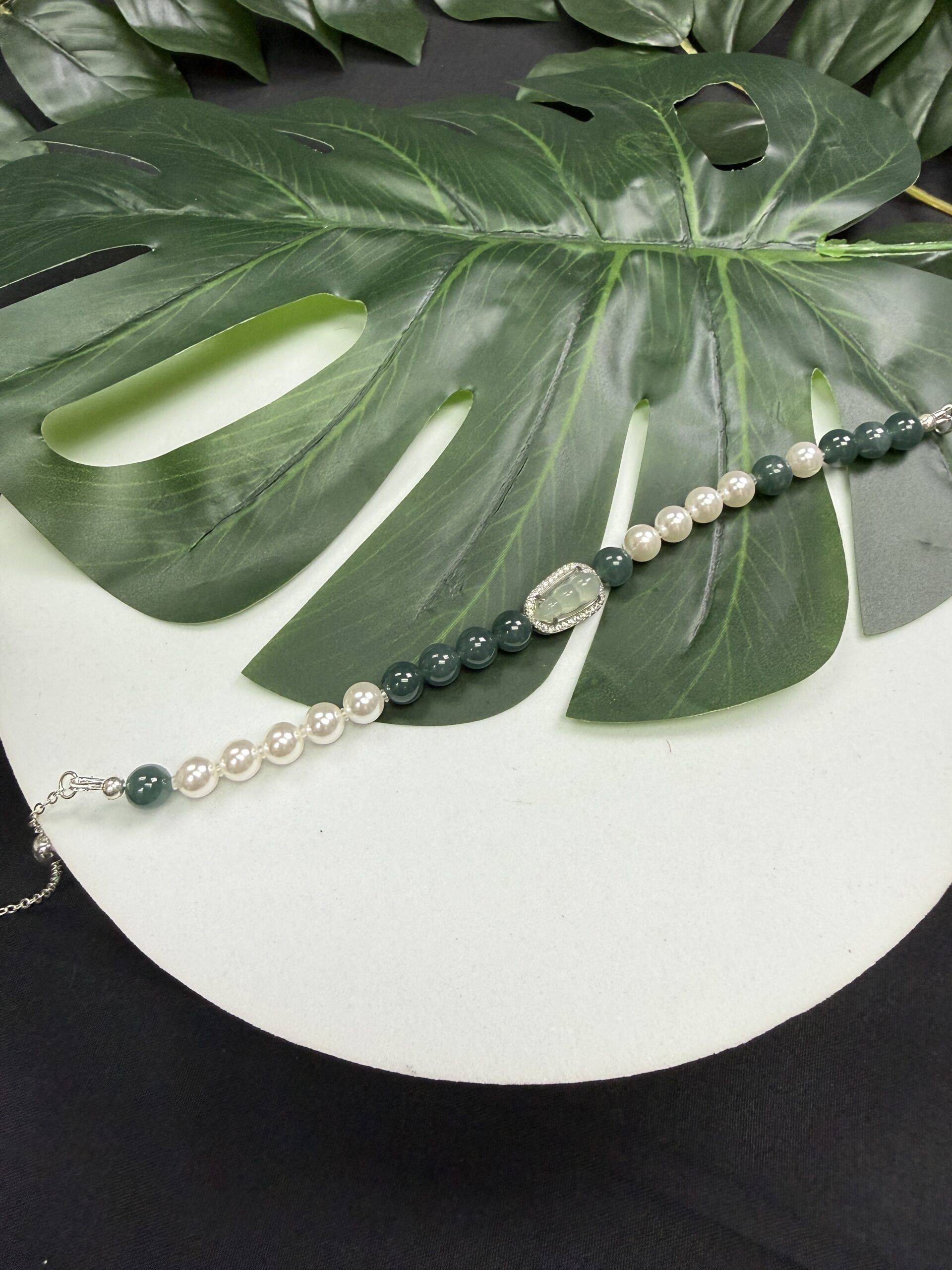Composition: Centerpiece ice-type white bean-shaped jadeite# in sterling silver inlaid zircon frame measuring 13.5×9.5×6.7mm (1), 6.5mm bluish green jadeite beads# (10) and 6mm white shell beads (10) secured with sterling silver chain and clasp