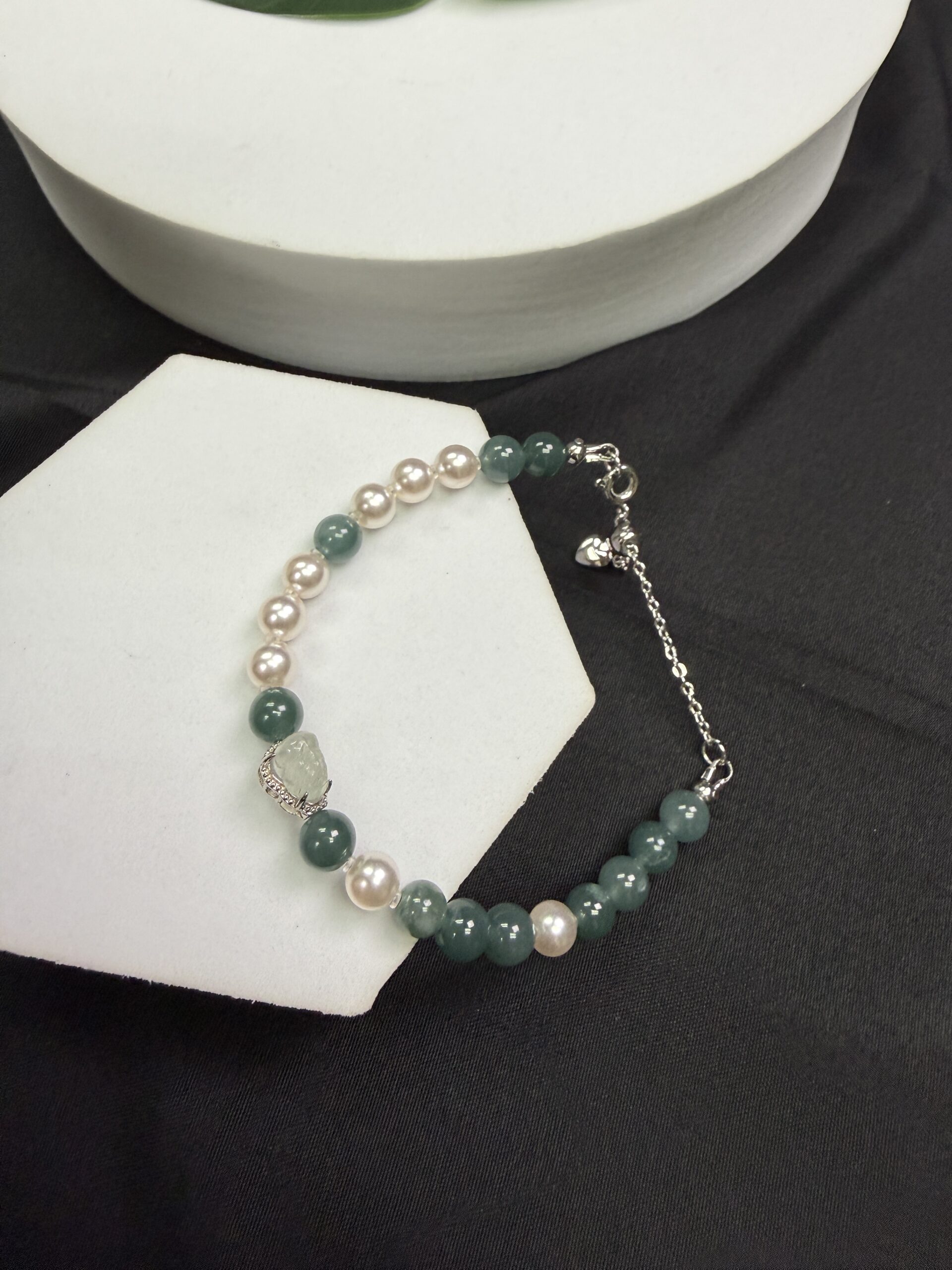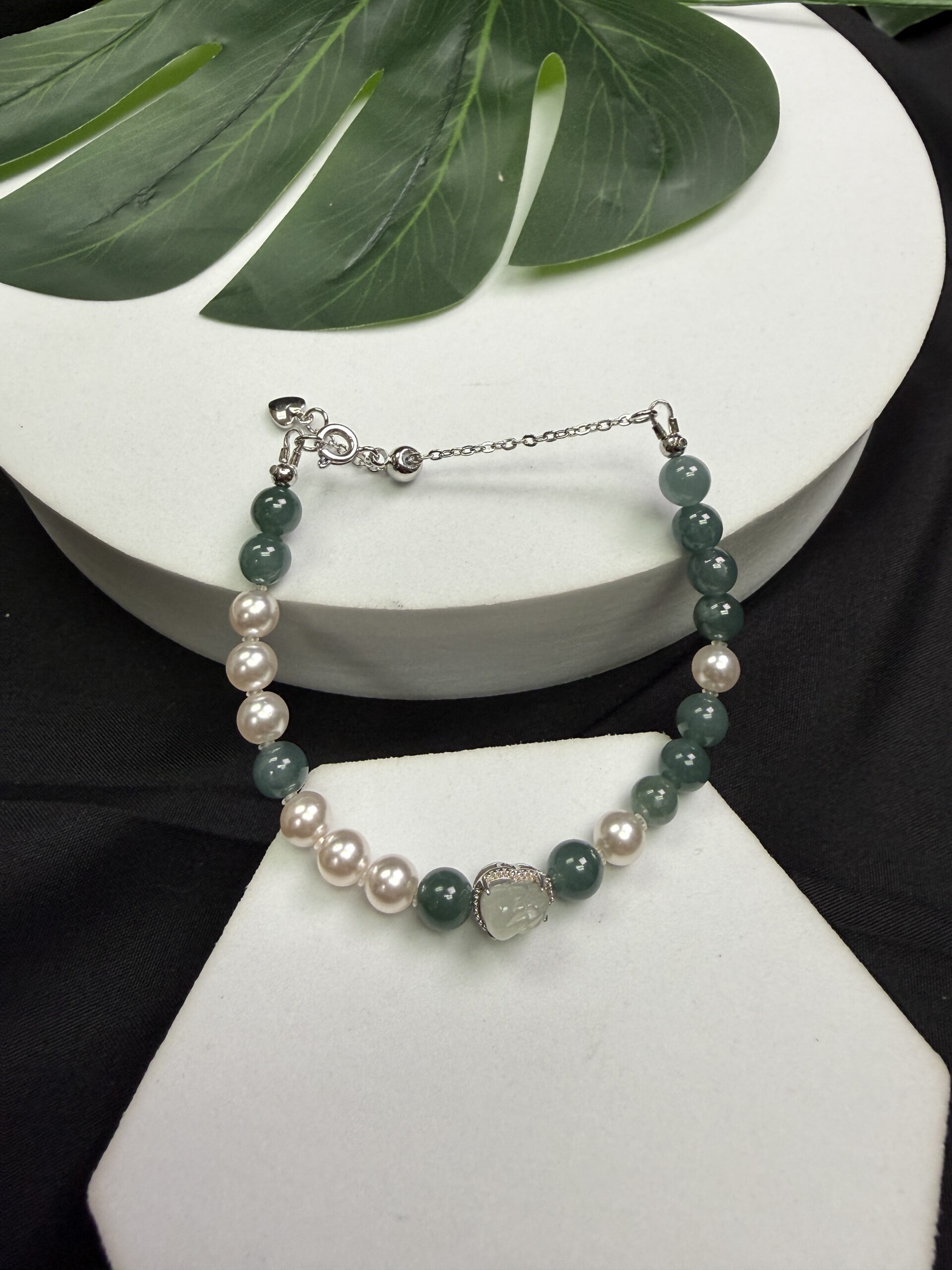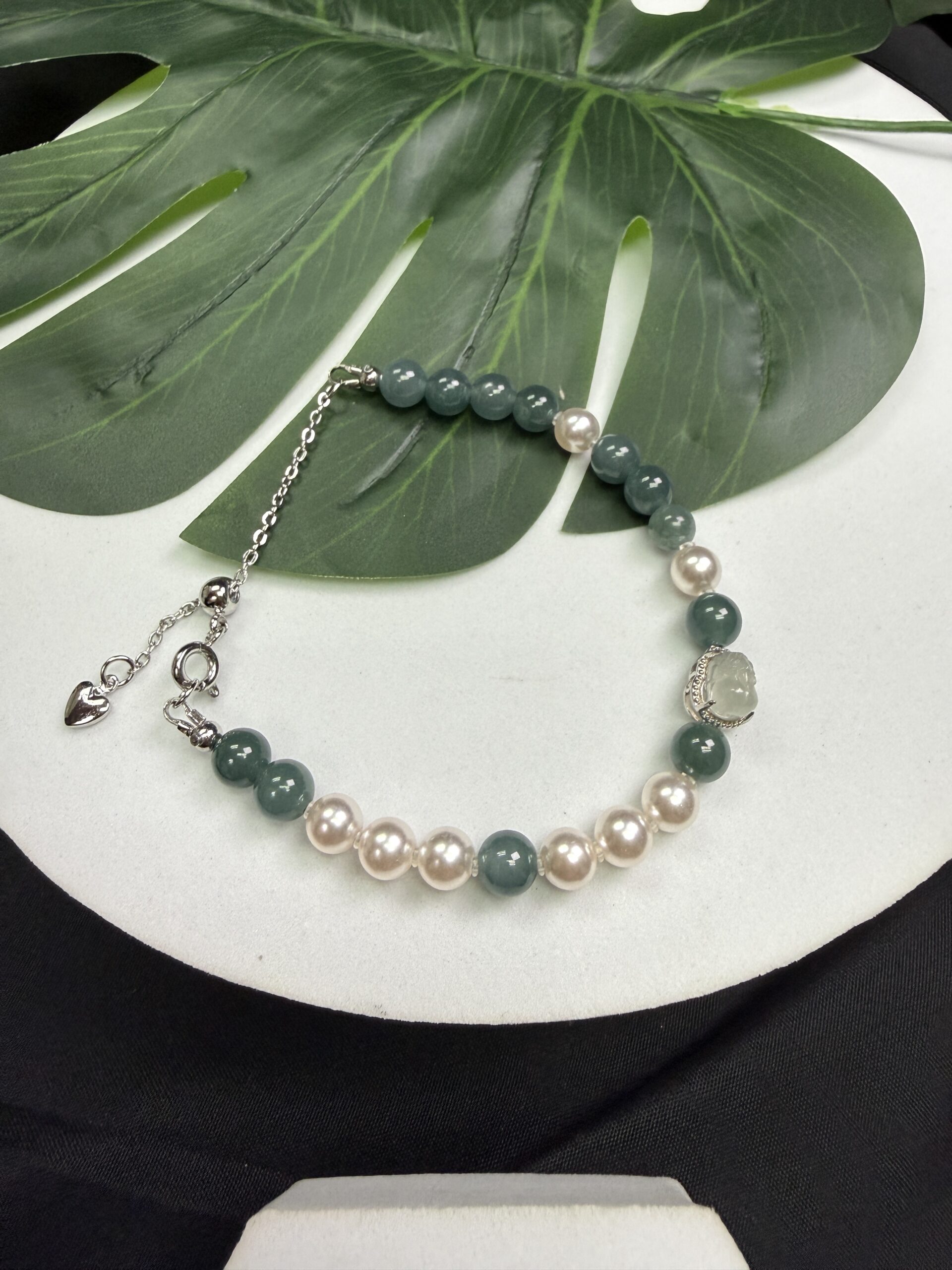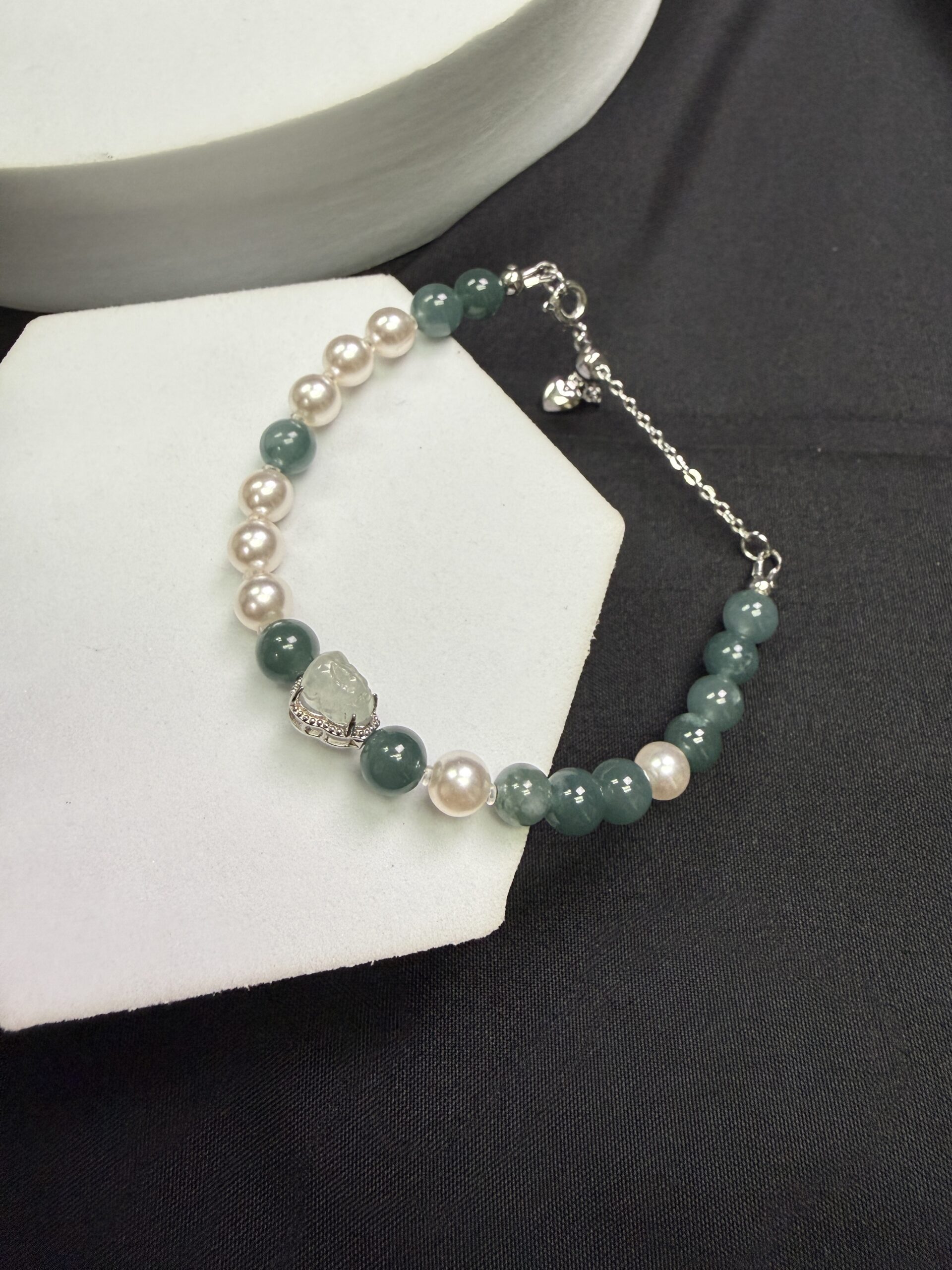 Composition: Centerpiece ice-type white golden toad-shaped jadeite# in sterling silver inlaid zircon frame measuring 9.4×7.5x8mm (1), 6.5mm bluish green jadeite beads# (12) and 6mm white shell beads (8) secured with sterling silver chain and clasp