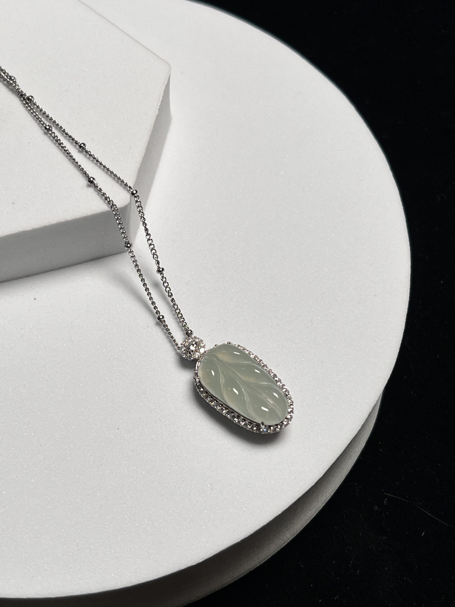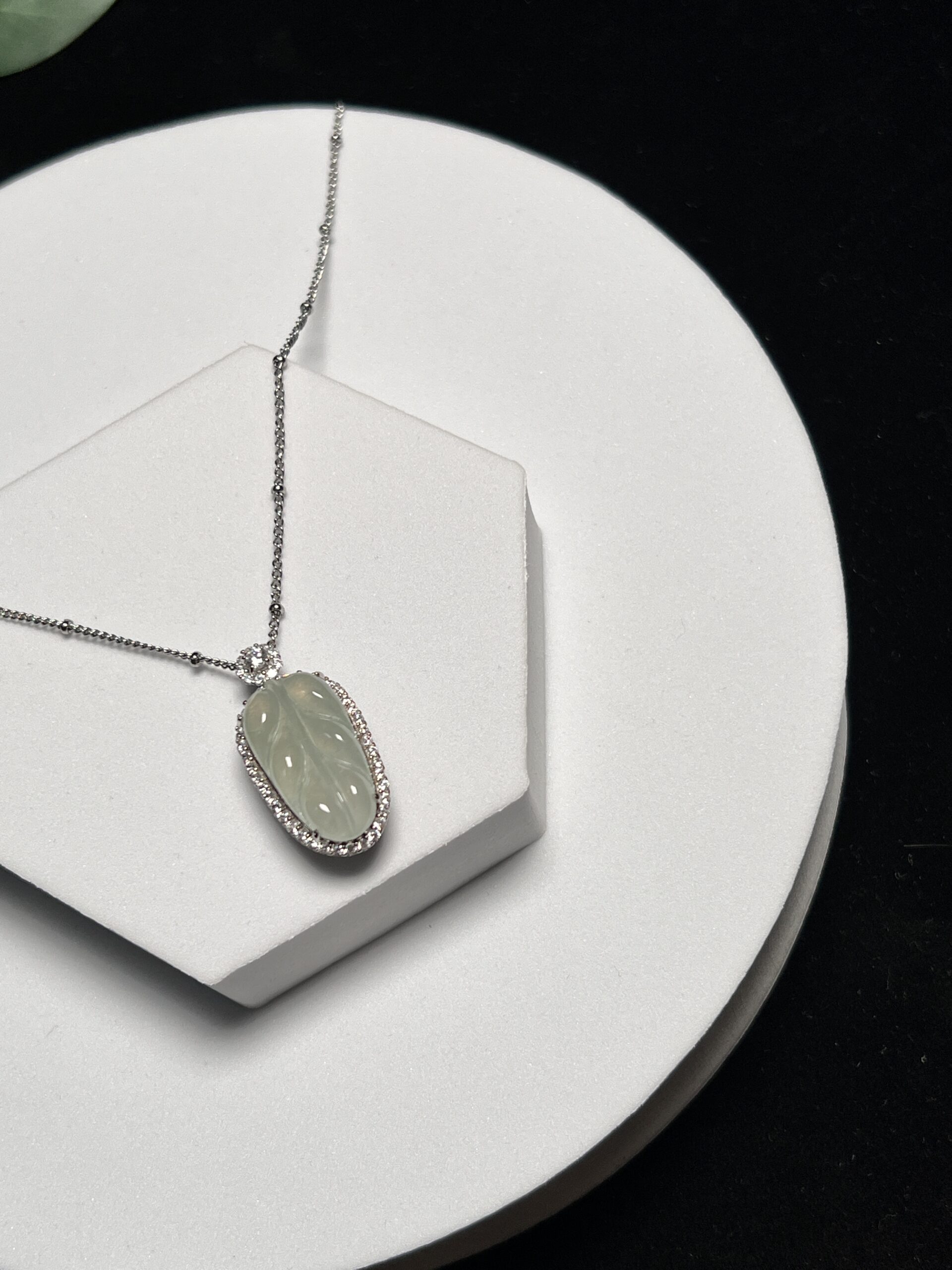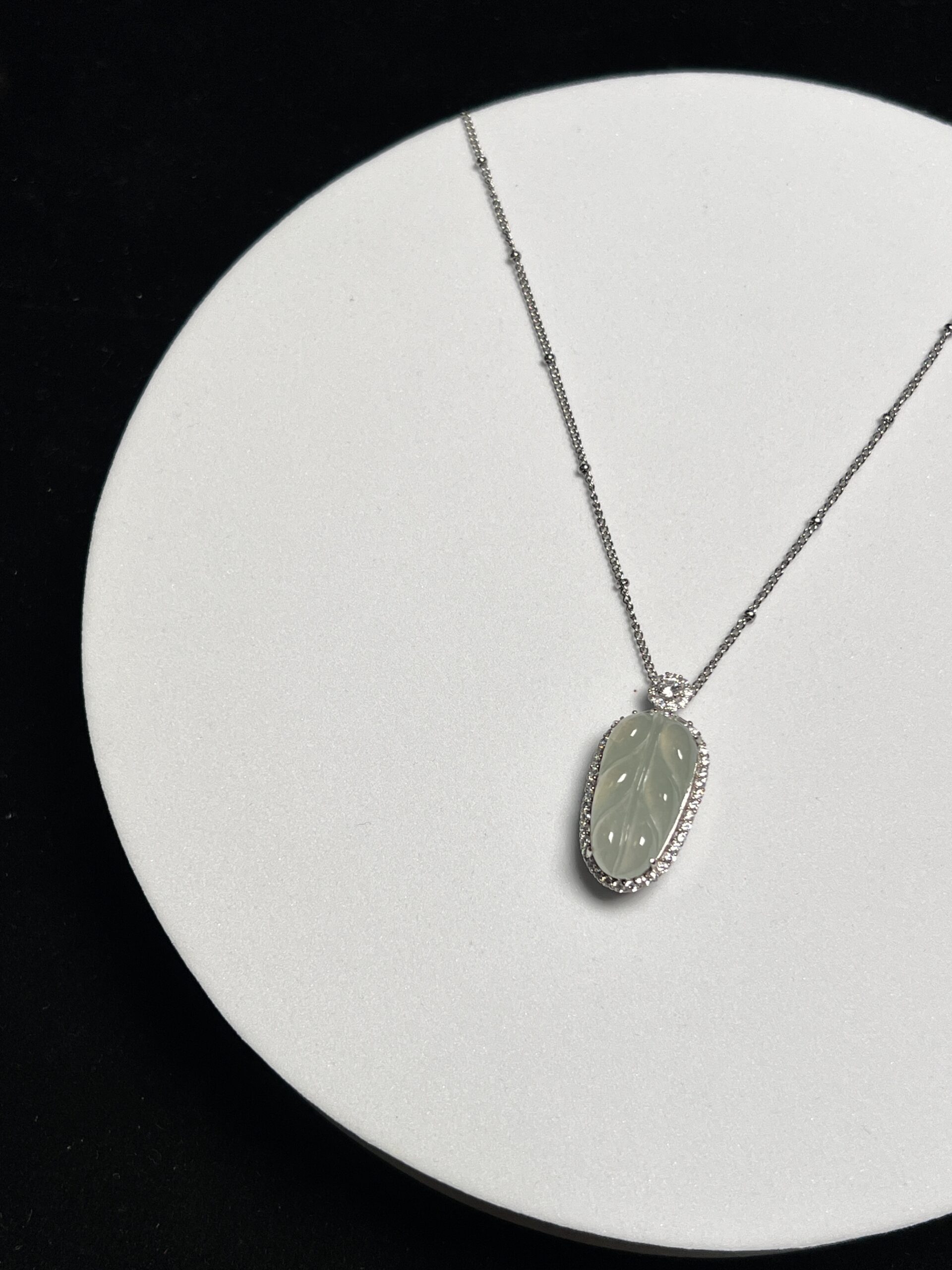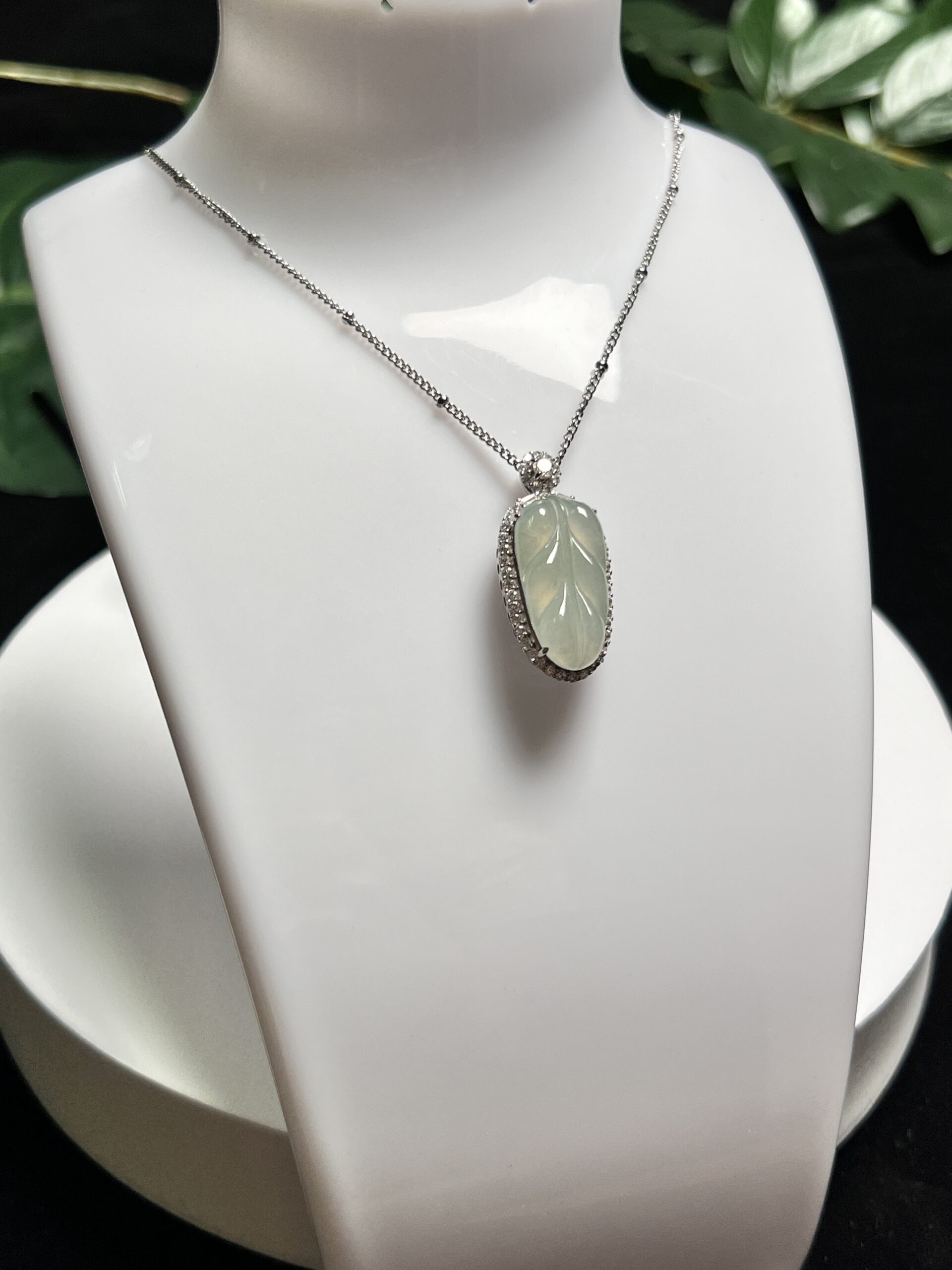 Composition: Leaf shape jadeite in sterling silver zircon inlaid frame measuring 14.9×32.3×10.4mm