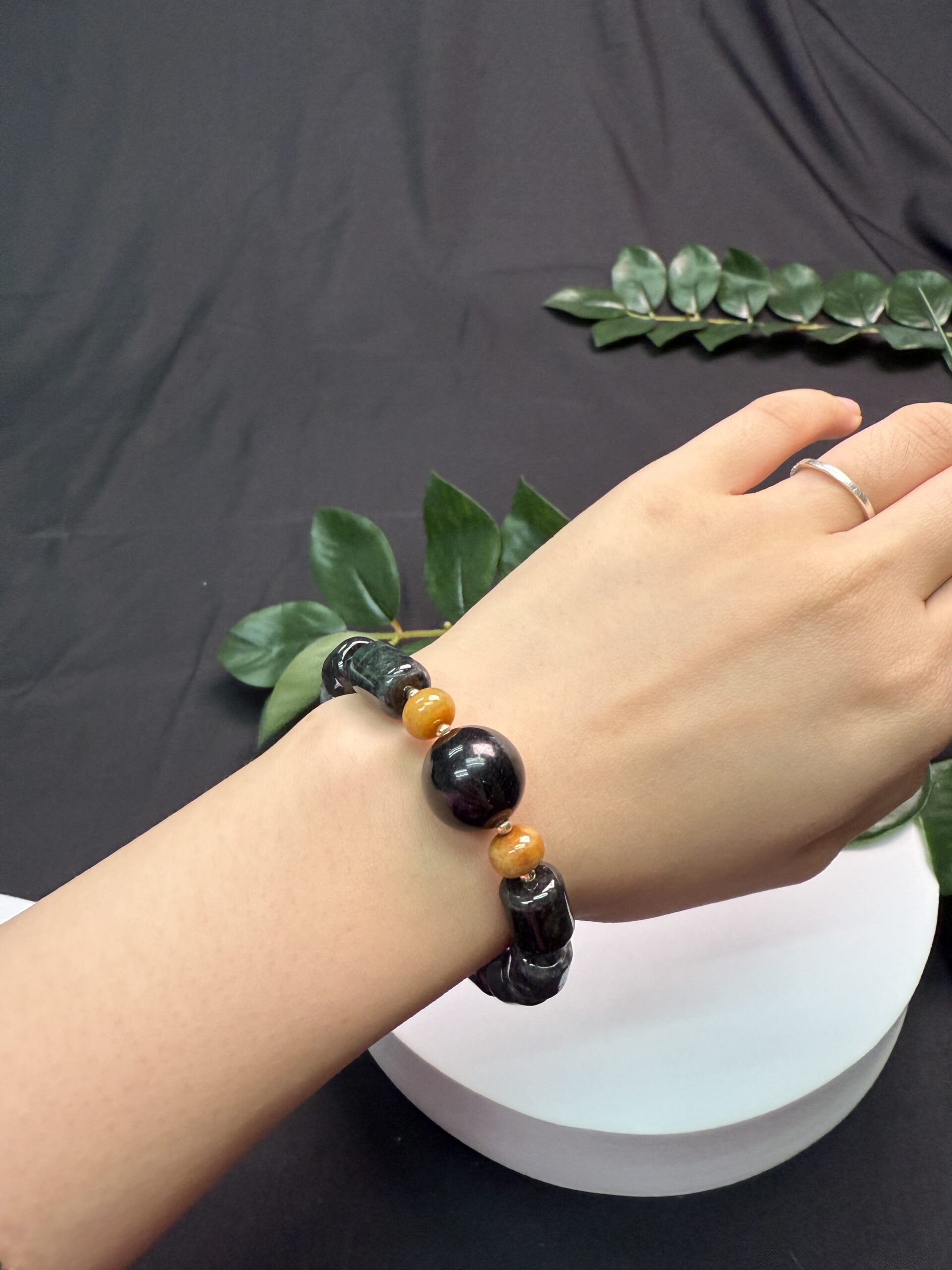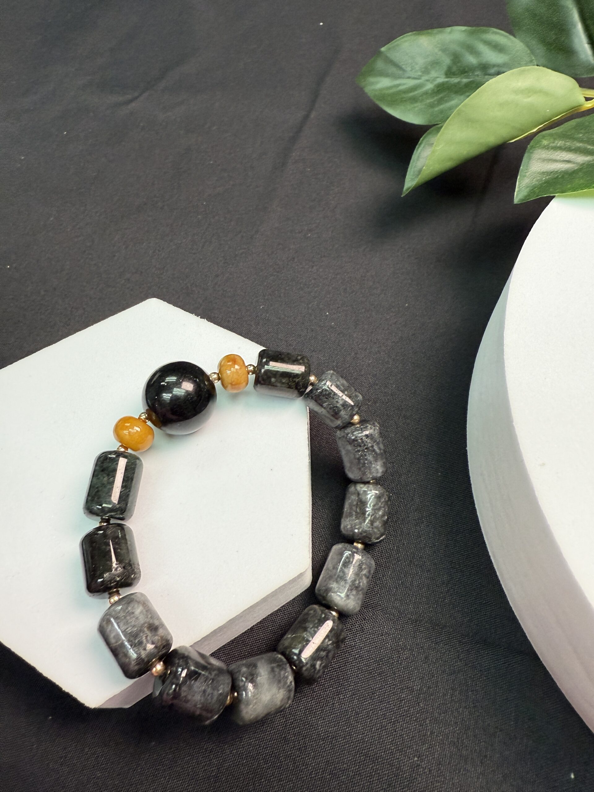 Composition: 16mm wuji jadeite bead# (1), 10mm wuji jadeite barrel beads# (11), 8.5mm yellow jadeite abacus beads# (2) and 2.5mm 14k gold-filled spacer beads (14)