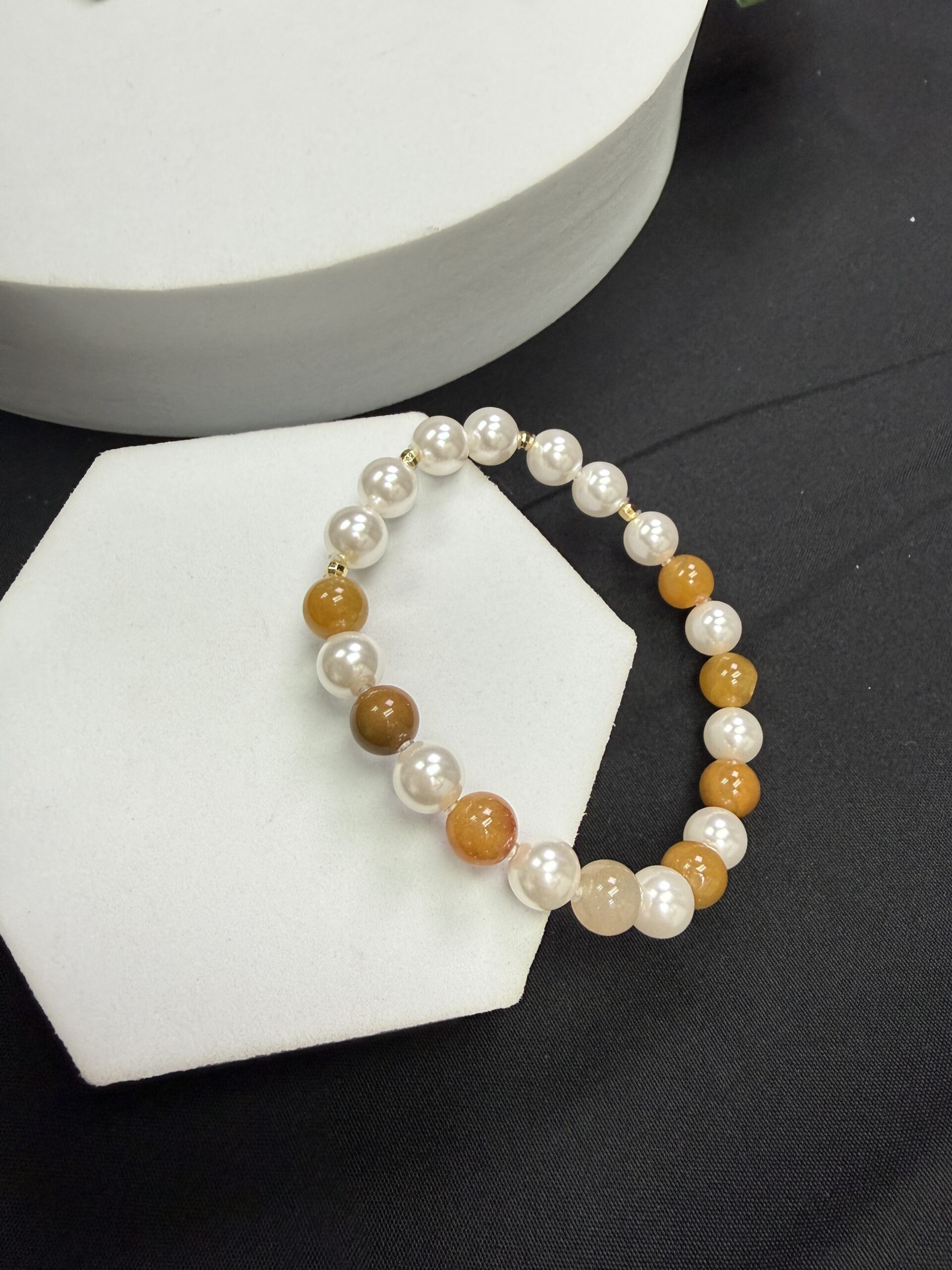 Composition: 8mm yellow jadeite beads# (8), 8mm white shell beads (14) and 18k gold filled spacer beads (4)